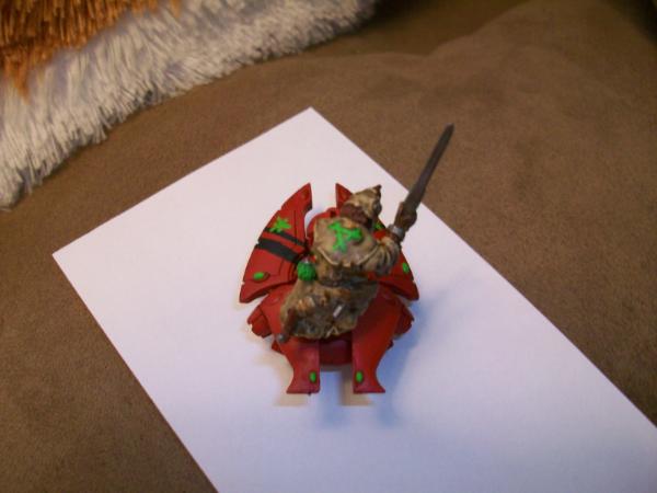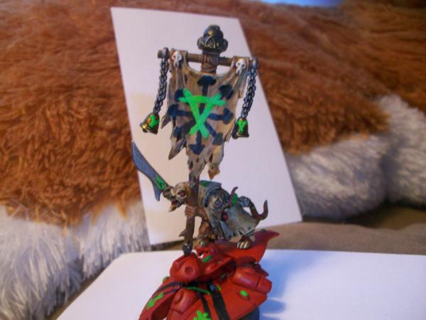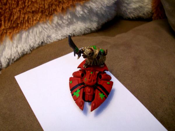 I got this mainly done, just need to get his banner done once I get my paints in I can work on it. This is my Commander, Floating around looking down on the other Skaven on a modified eldar guardian weapon platform. The signs of the horned rat and nurgle(opps it's upside down) are painted on the platform. The whole army will have scattered pieces of Marine,Eldar and nid on either the bases or on the models.