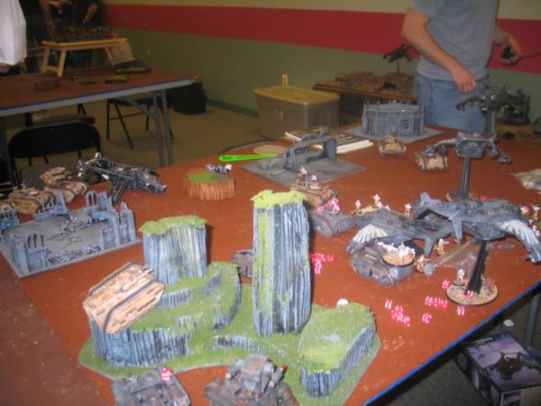 Right vendetta shoots at his right farmost vendetta and fails to score a hit. Closer vendetta fire's at Andrew's closer Vendetta and shakes it. The las plas vets in the forest fire at it too and destroy it. other las plas vets fire a single las at the far vendetta but miss. Manticore bbqs Alrahem. Platoon command and las plas chimeras fire at the vendetta on the left scoring a lucky glance shaking it.