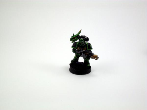 The decal was put on and painted over to give each marine a more unique feel. I may still wind up buying some more bits to make the plainer bolter marines more 'ornate' with scrolls/salamander bits etc. Also touch ups (like some paint on the base) and a varnishing to protect the company
