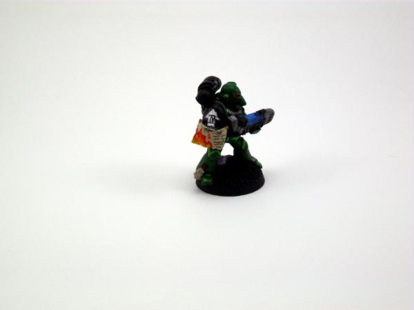 This would be the sarge on his lonesome. I'm not sure if this pic is too large or fuzzy but I tried to zoom as close as the macro flower would get. That would be a lizardman head on his shoulder for quick I.D. and an old bolter side clipped and combied with a flamer.