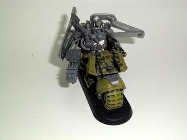 Here's his back from the apoc game. He is getting closer to what I want done but still needs work. The servo arms need to be fleshed out so as not to look like 2 cross beams. I also need to assemble the Captain and magnetize his command squad so they can hoof it or get on bikes.