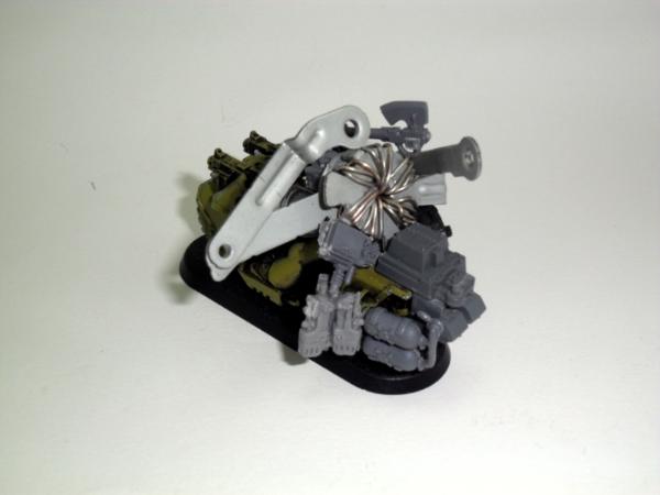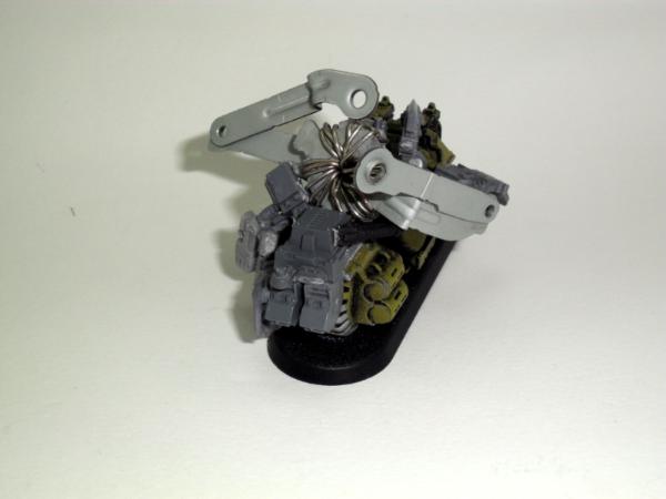 Yes the servo arms move, I just need to round them out so they aren't so flat. And put clamps/drills etc on the ends. I pulled them from a VCR so I think they were part of the rewind/fast forward mechanism. Some tank ant. bits and 3 plasma pistols make up the welder and flamer on that harness; plus some wires wrapped around the back for effect. I may mess with the facebits some more as it doesn't seem right yet...maybe wait and prime it to see if that changes it.