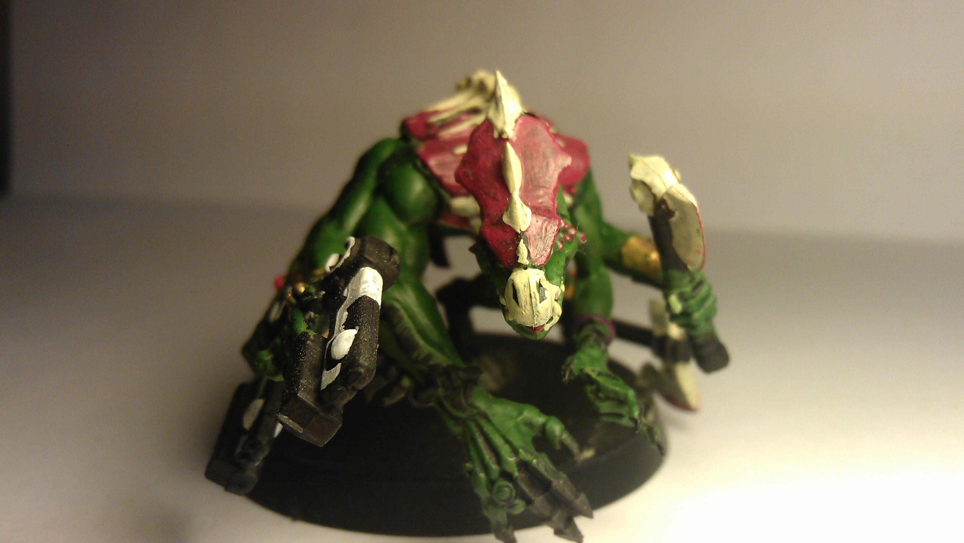 The Sslyth was made from a genestealer body, lizardman head, pink horror arms, with tau drone guns and dwarf axes. I have another of these armed with swords.