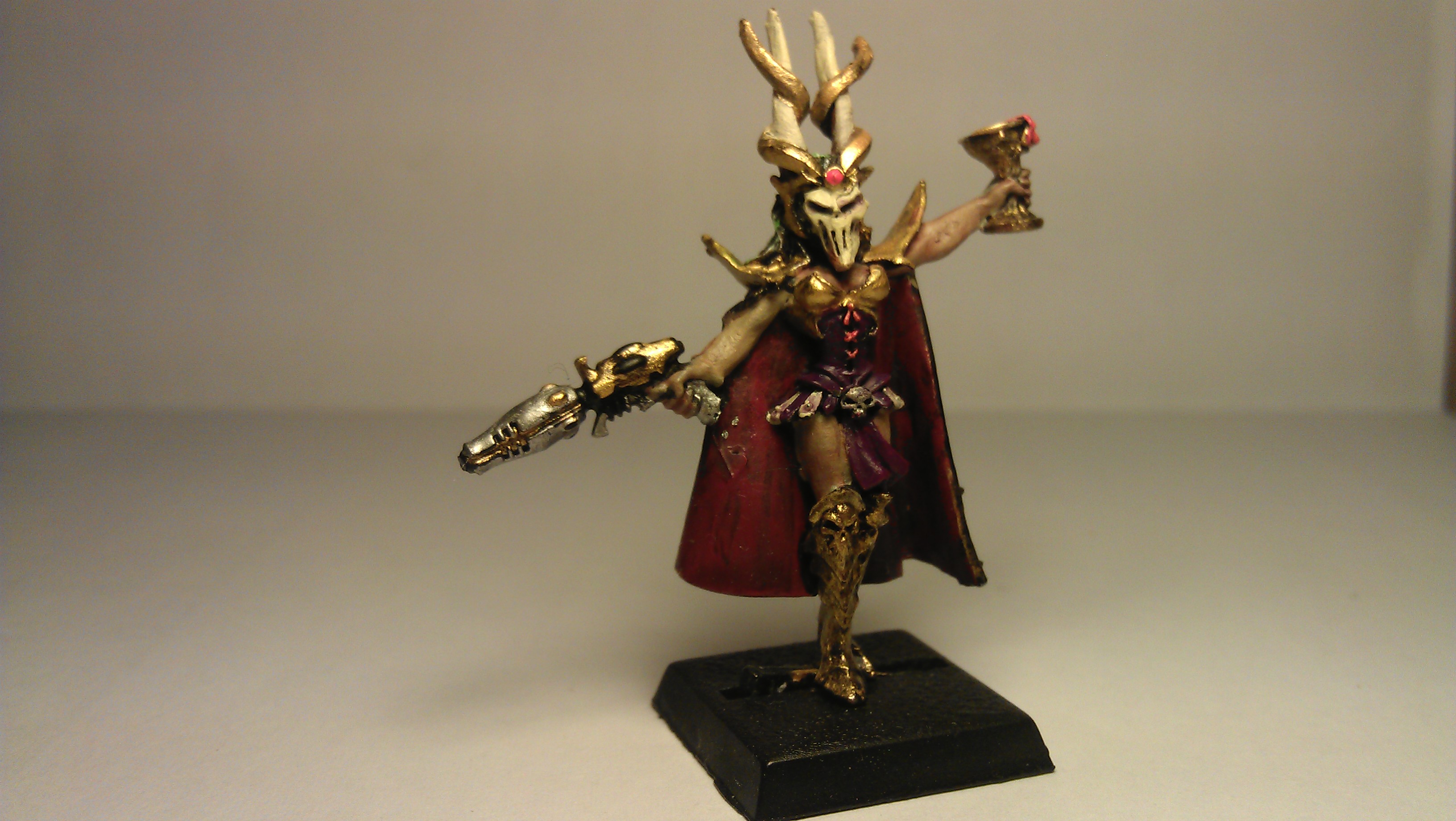 Automatically Appended Next Post: The Lhamaean started life out as a Dark Elf Sorceress from the Cauldron of Blood kit. I carved her face off (which sounds cool just to even say) and replaced it with the mask from the Death Jester. The blast pistol will be replaced by a splinter pistol soon to better fit the idea of a poisoners weapon. Or possibly something made to look like the needle pistol from the DE codex.