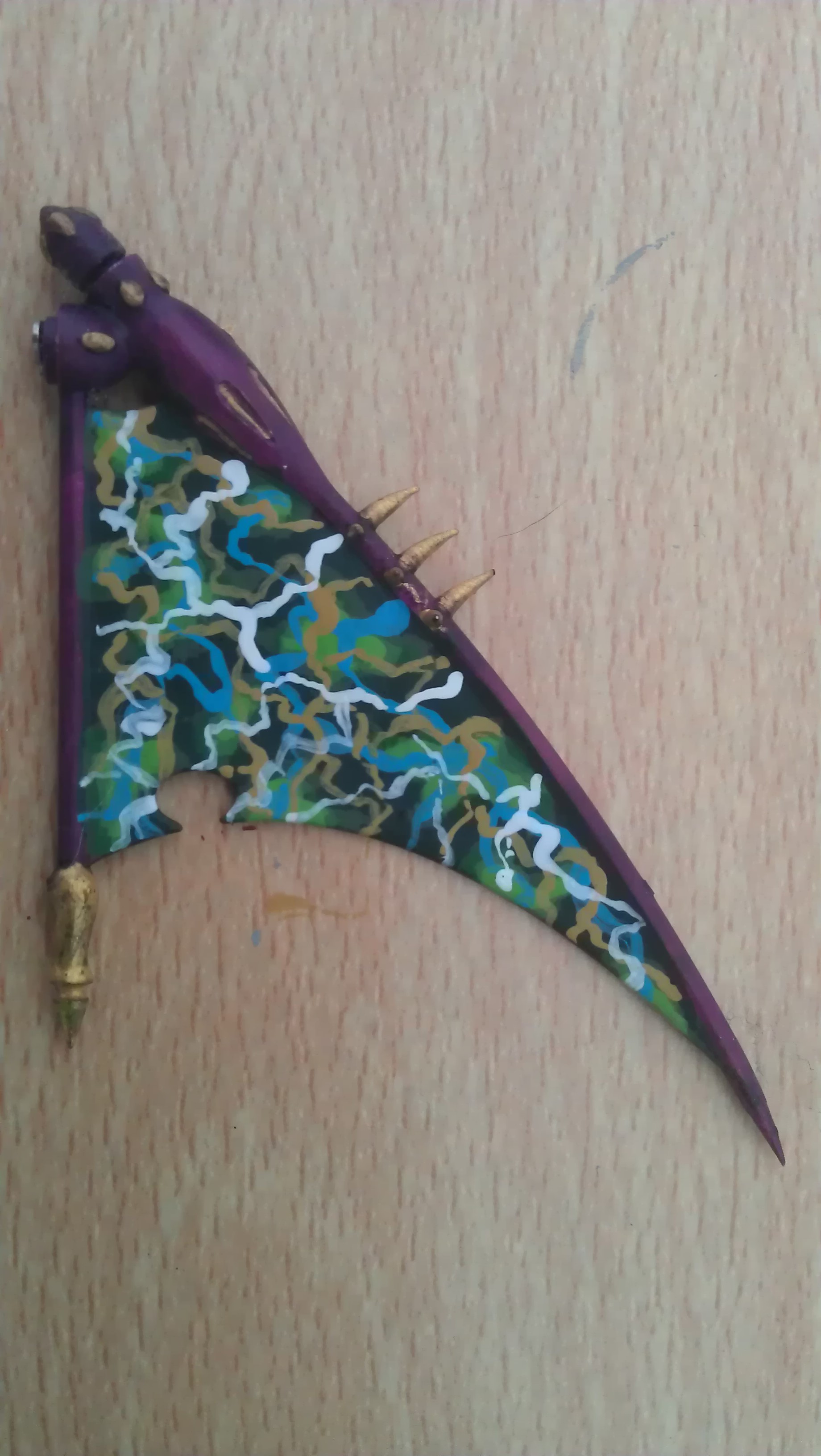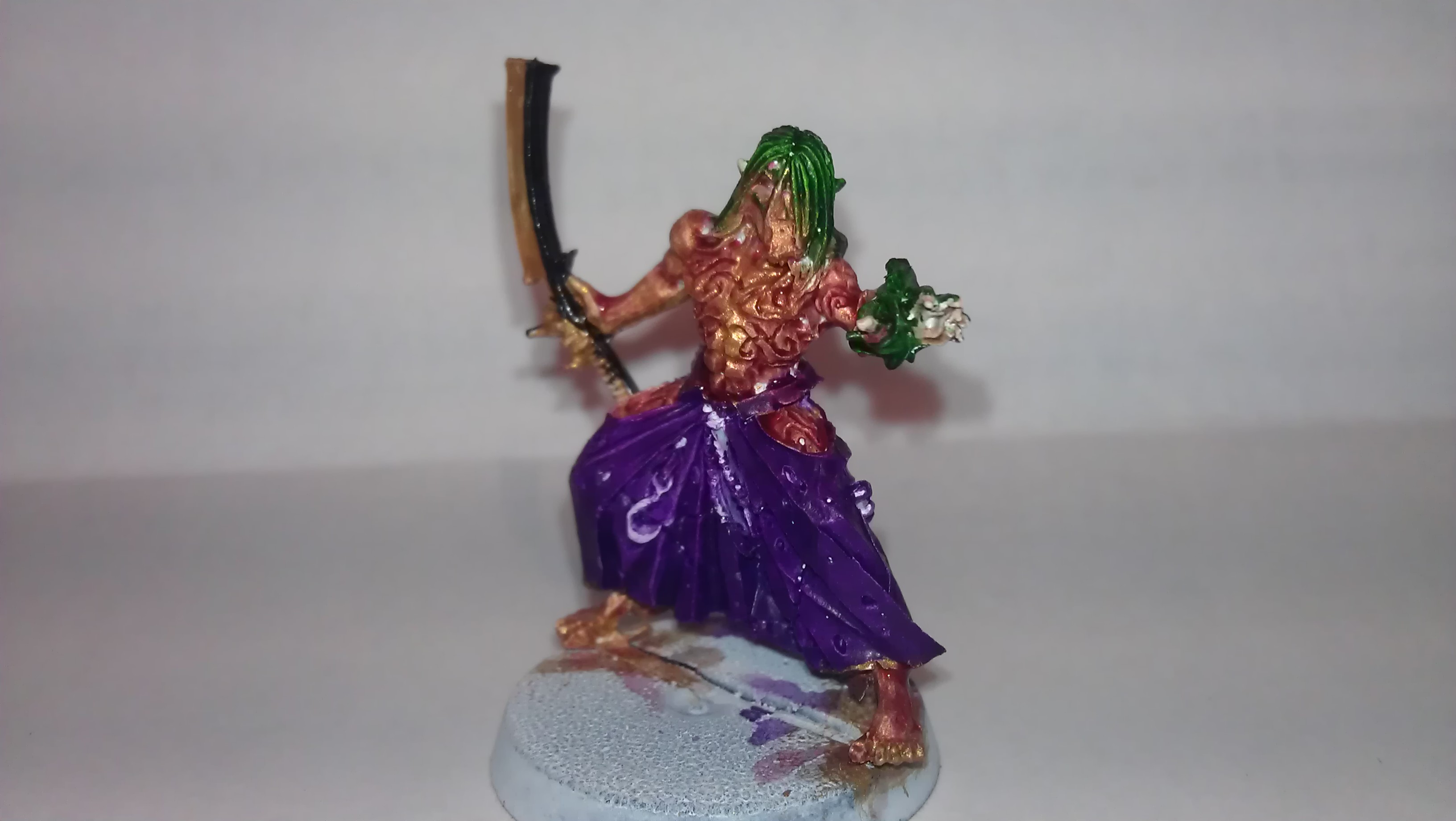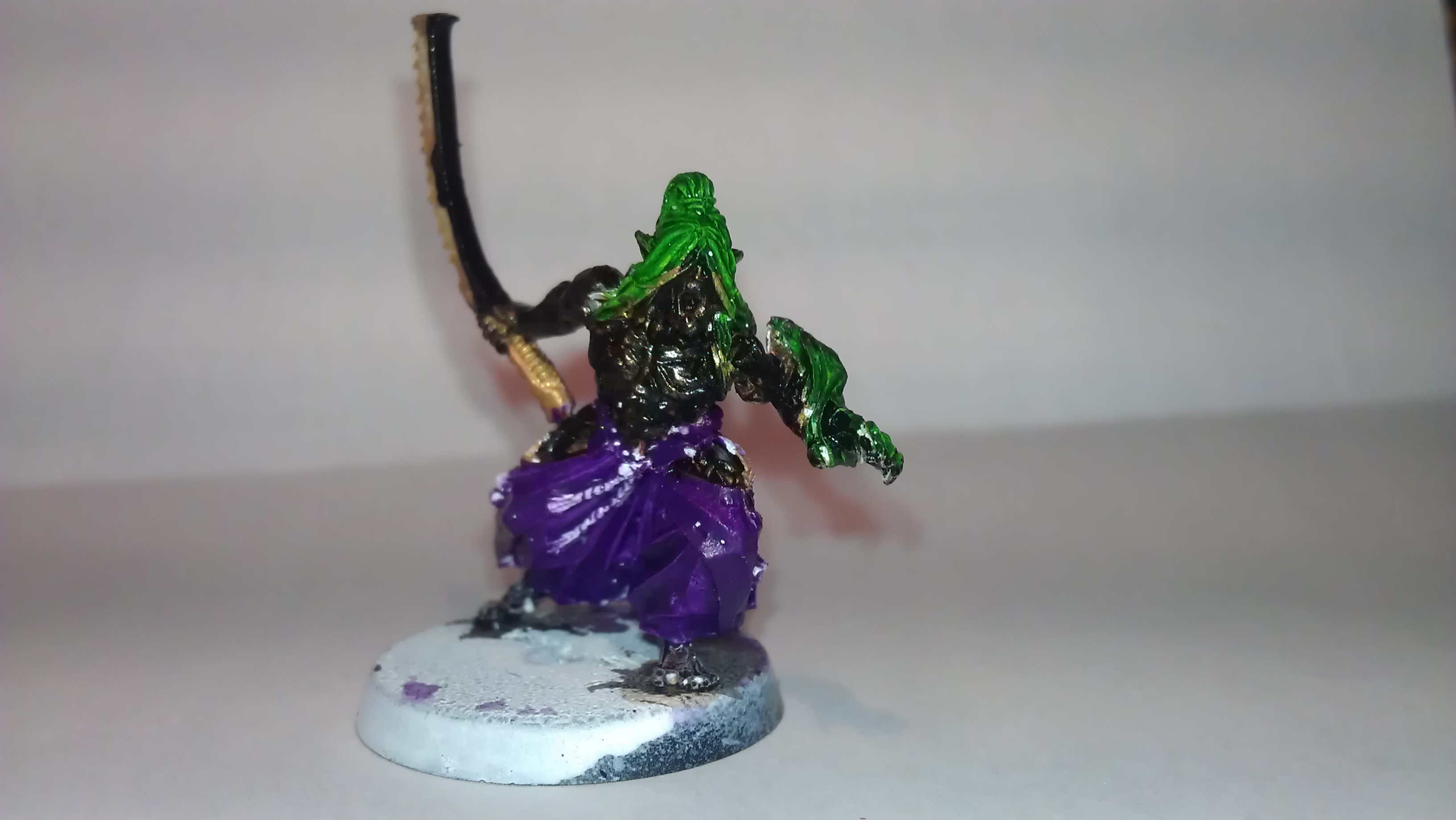 The Warrior's there just to demonstrate the colour scheme that I'm working with, in how the gold and purple alternates over each armour panel. Also replaced his lefthand with a blade, inspired by the skaven release White Dwarf - there's a clan that does exactly that, which gave me a what the hell moment, bye bye hand, hello the very definition of punch blade. His sex life's taken a bit of a blow though.