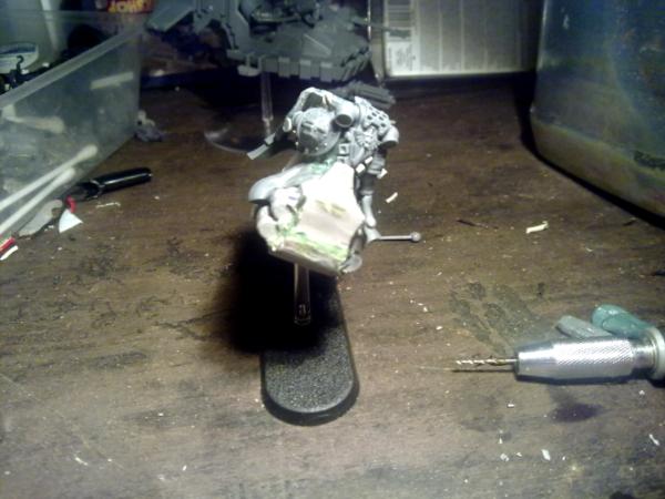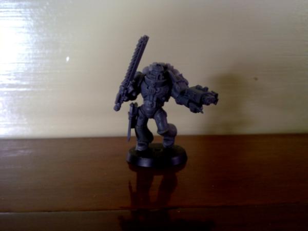 If you are open to comments, I would trim down the barrel of the minigun by half, take out a middle just behind the beginning of the barrel and trim down the rear section, I would do this because the weapon is massive and to me I would like to have some resemblance that he could carry it (I know 40k where aliens and men in armour fight to the death, where's the resemblance there)