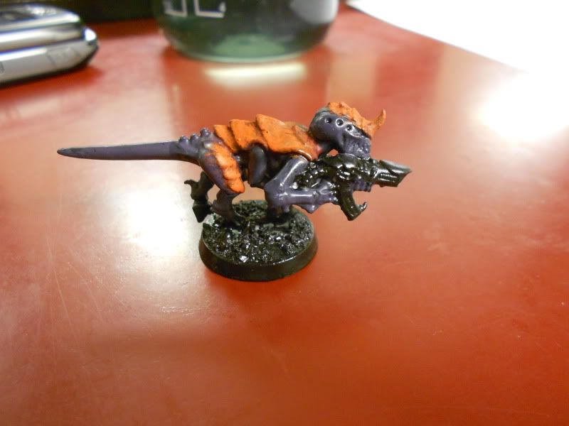 Not bad for my first try but it needs some work. What I think I need is more colors mixed between the red gore and the blazing orange. I will try blood red once I can get out and buy more paint. I also am going to run a red wash over the whole carapace as I think it will even the shades and really accentuate were each plate starts and stops. As for the rest of the model, I will be purple or blue washing the hormagaunt purple (as well as cleaning up the edges) and adding either pink or enchanted blue on the more vulnerable bits. The teeth will be white but eyes and hooves will be yellow. I am looking for suggestions/inspiration for the gun because I have mixed feeling about it.