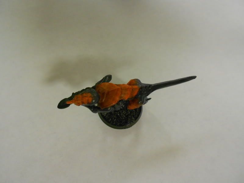 as for the eyes, if you have a very fine brush, you can find them at the craft store... It will be finer then the pin, but will allow you to use it to do the other detail on models. I brought my gaunt to the store, and found a brush that was small enought to get the eyes painted. Try watering down the orange if it is really thick. if neccessary, it might take severel layers of thin orange. and no I dont think that the red take away from the orange at all. Nice job!