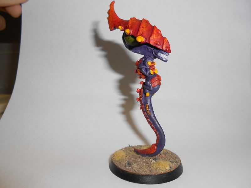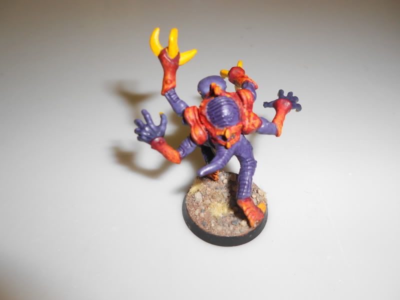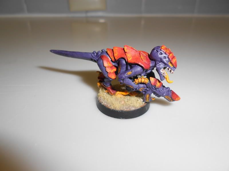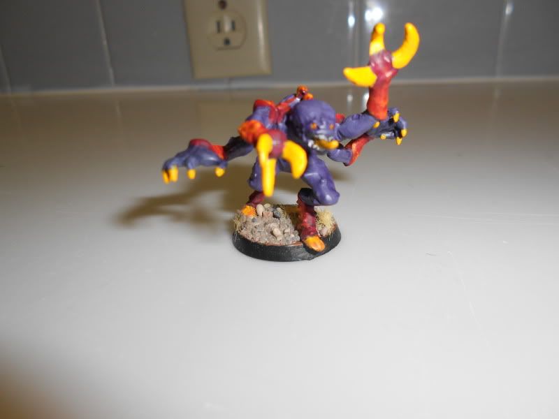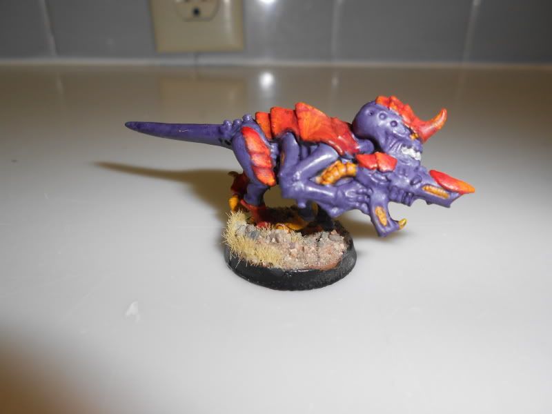 The first picture is after two coats of Red Gore and one of Blood Red. Second Picture includes a rough layer of thick blazing orange and then a watered down layer. The final picture has some specked Golden Yellow. Body is Hormagaunt Purple with two washes of Leviathan Purple. I used Ogryn Flesh on the feet and Babab Black in the mouth. The base was painted with really old LOTR paint kit unmarked brown.