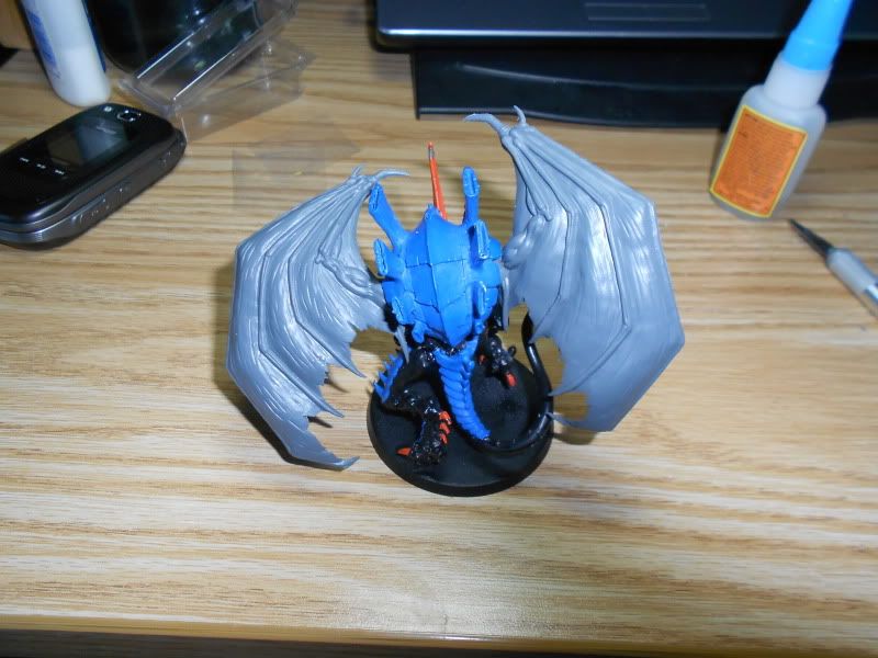 I ordered magnets four weeks ago, but they never came in the mail. I ended up borrowing (considering that they are glued on my models I guess it is not really borrowed) magnets from a friend the day before the tournament. I am pretty happy with the magnetizing of the carnifex and Tyrant. I think the wings look pretty natural where they are placed (not to mention actually capable of listing his bulk). Not sure if you can see in the picture but I modified the devourers so that both sets are on two arms to keep with the Tyranid six limb fluff.