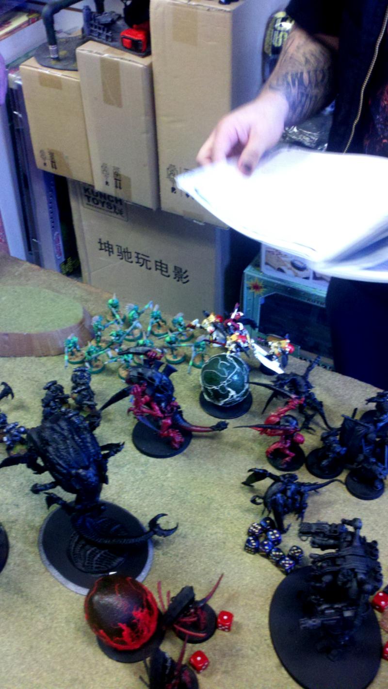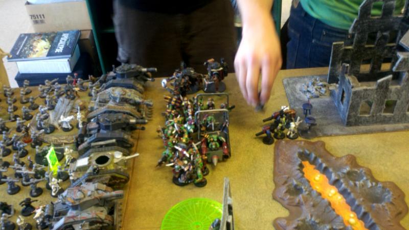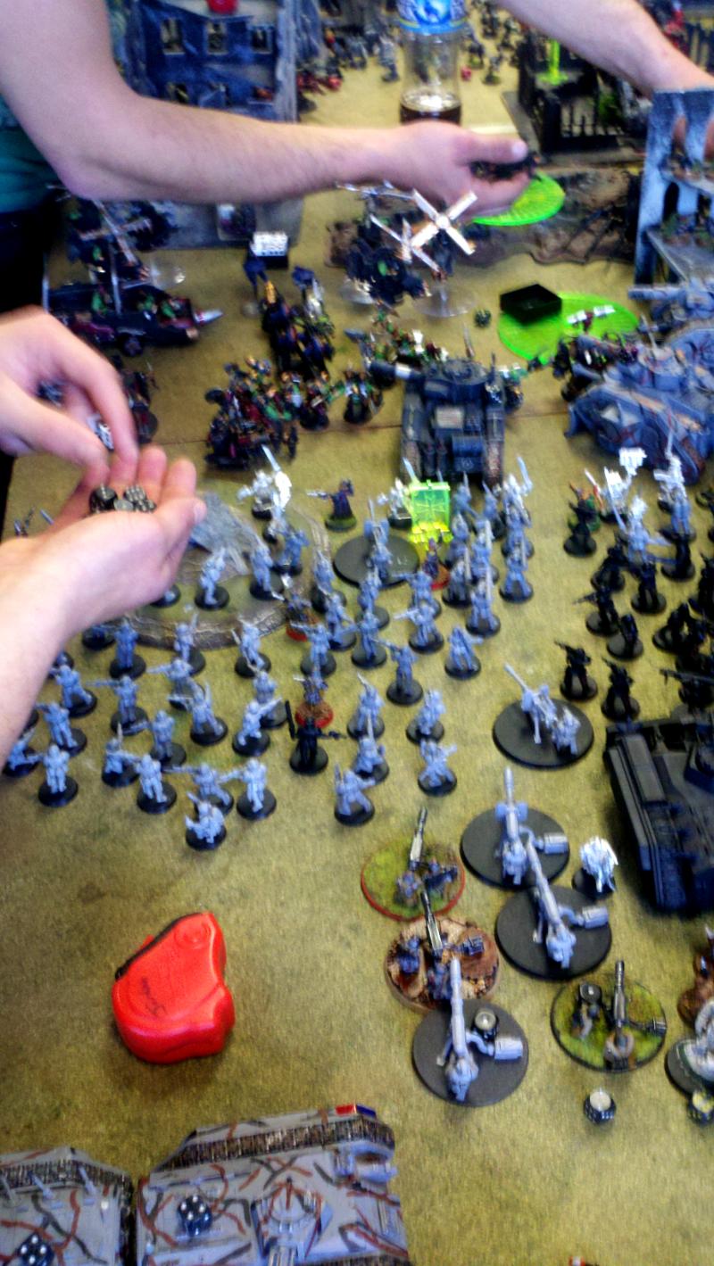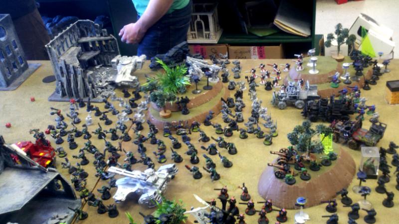 About a week ago we had the idea to have a 'big game' as our local store was closing. This past saturday, it all came together. What I had originally thought to be a simple (in some terms, anyway) 2v2 apocalypse match quickly turned into a 4v4, 18,000 points per side match. Averages at 4,500 points per person. Also, pictures were taken on my phone so sorry for the assuredly blurry shots.