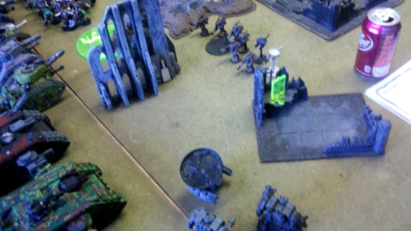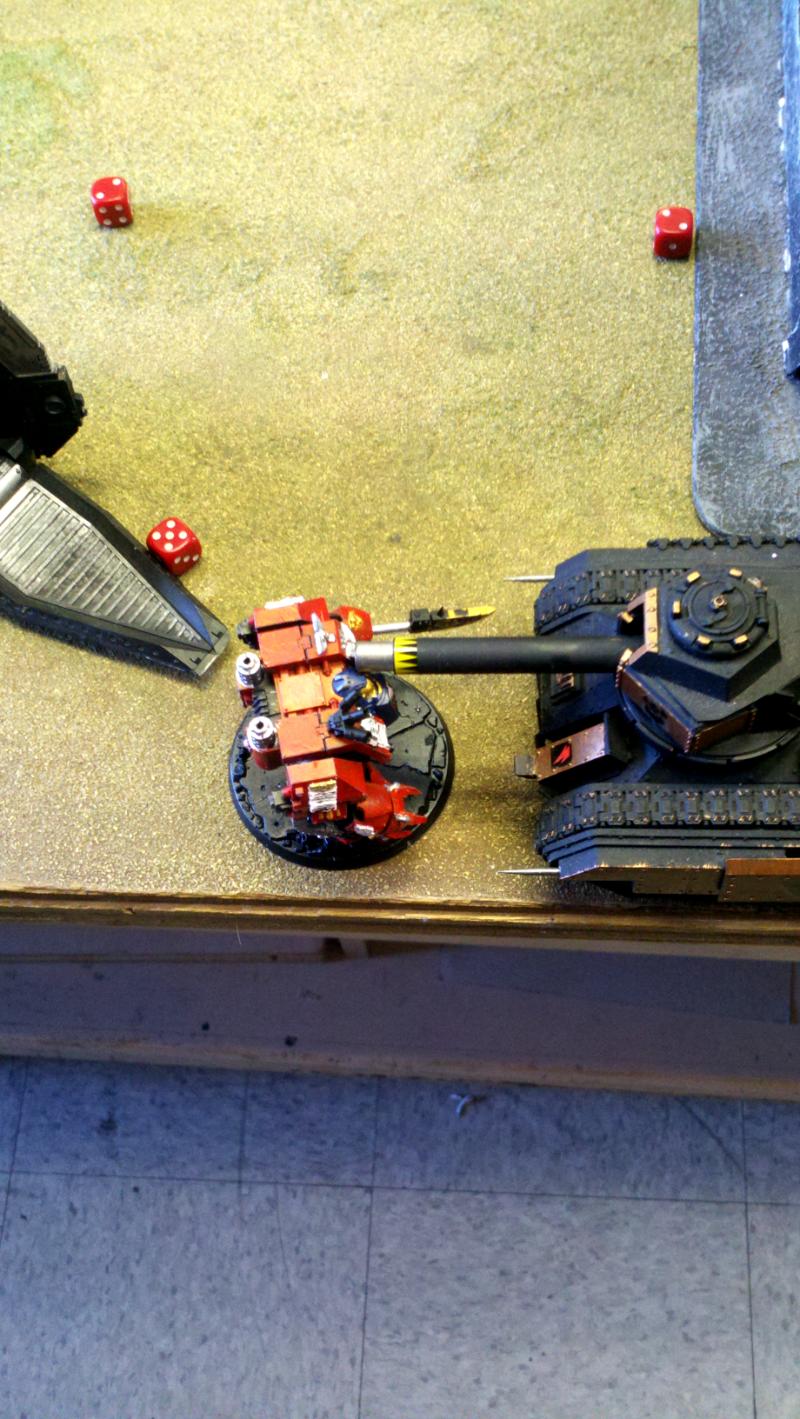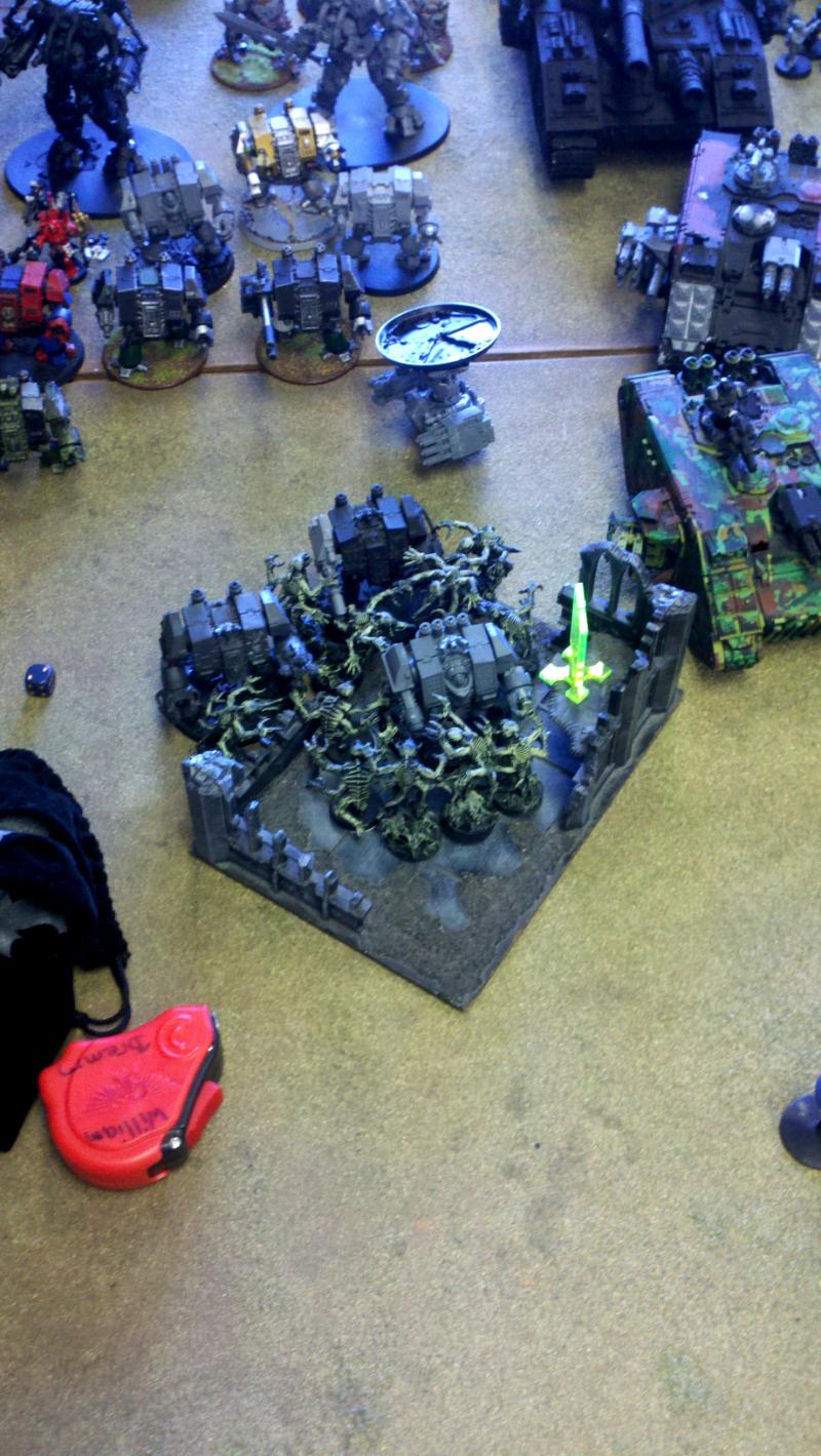 MANz, killing off most of them. What were left were killed off in assault. The techmarine comes over from the dreadnaught formation and fixes up the baneblade, allowing it to fire next turn. Combined shots from the dreadnaughts and anything else possible fail to penetrate the battlewagon's side and frontal armor, allowing it to contest the objective. Again, fuzzy on the details of this turn.