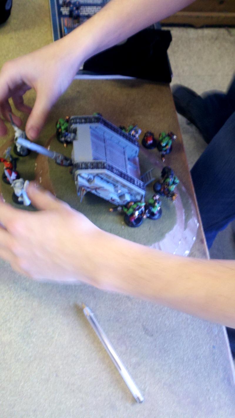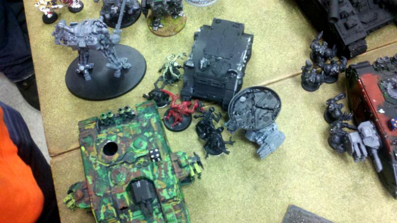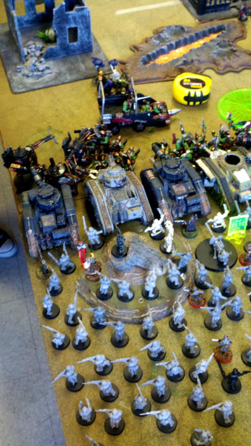 IG blob, killing over half but taking serious wounds in the process. Combat continues with his squad. Dreadnaughts on the left are damaged slightly, but nothing is wrecked by powerklaws. Lastly, the nobz and crew manage to break through the armor line, exposing the