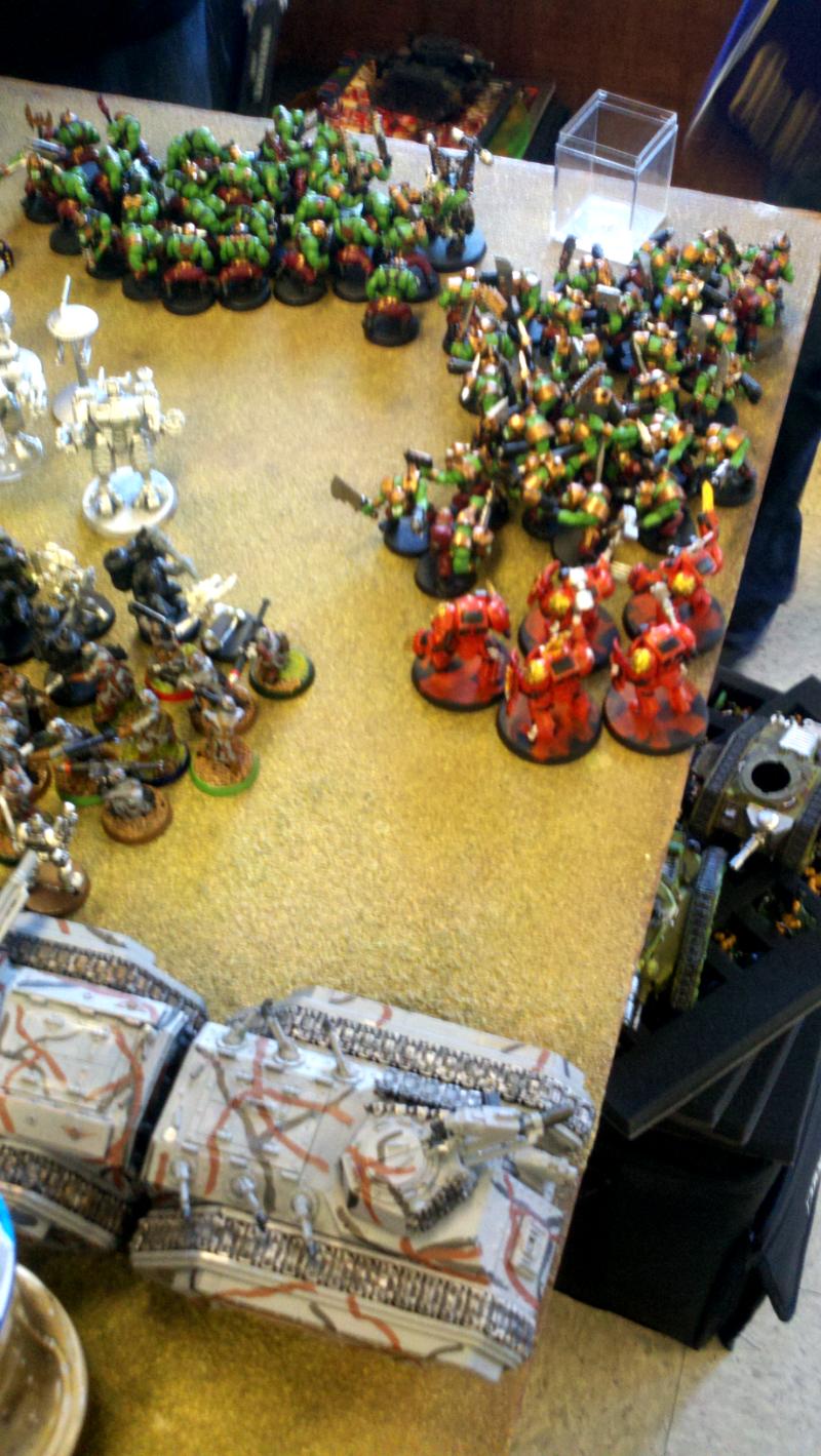 FOUL XENOS -- two Ork hordes, a Tau sept and a gigantic Tyranid brood. Yeah, sorry--I don't have the lists for all the players, so for now it'll just be a nice report with lots of pretty pictures. There were others that took a good amount of photos, so more is better...hopefully they post them. The table was set up in thirds, 12x4 foot long. Easily done, each 4x4 square of terrain was designated for deployment space and a no-man's land.