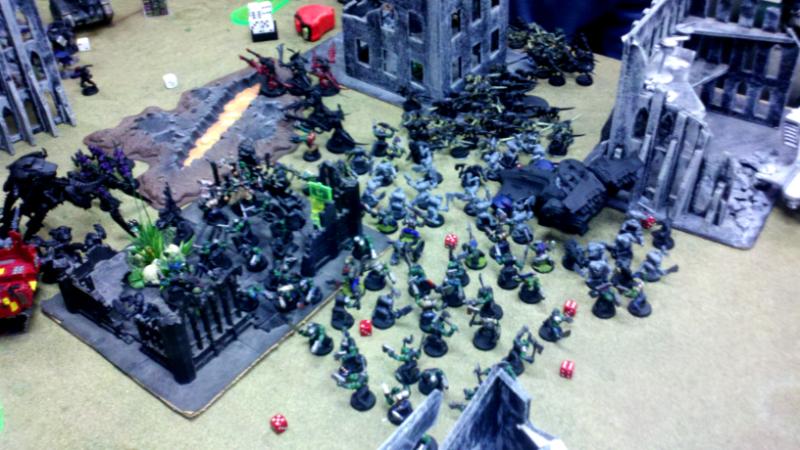 More boyz come on scene, aiming to take out a few dreadnoughts. Zagstruk and his ladz pop in close to the Mawloc (?) and some crisis suits (not yet pictured). The tide inches forward to the middle objectives, and Icefire rounds fail to deal any long lasting damage. Lootas don't really damage anything (cover saves upheld the Librarian Dreadnought). Zogwart has NOTHING to squig (and had nothing the entire game, which sucks). Other big 'nids arrive in the back and start their business with the Grey Knights, pulling quite a few into the backfield. Shooting wasn't effective enough for me to remember verbatem, with one notable moment--Kroot guns manage to kill off half of one squad of
