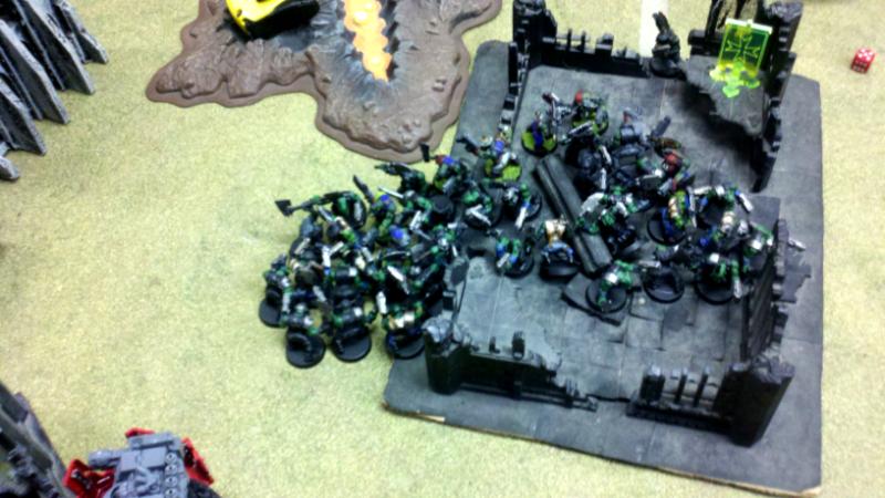 The tide gets further into cover, with most of what was left in terrain. You may have noticed one half of the formation was painted, and the other was not--in the Apocalypse Reloaded book it had what looked like two squads of 50 boyz in the formation. So, earlier I had split them off to assault the guard. Unfortunately I hadn't known that to all infantry units (key word being ALL), the lava pit was impassible terrain. So, as a result Zogwart and a Nob with 40ish boyz moved north and tried to get stuck in. They didn't, and were all together useless. Tau shooting finally removes the Librarian dreadnaught, preventing it from contesting our objective.