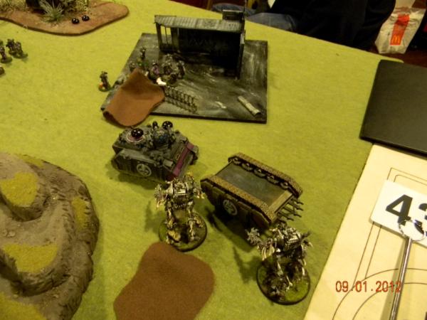 BSS on the right hand side of the table and immobilized the one at center board on a Dangerous terrain test. This gave me a slight chance now to be able to do a last ditch charge if I could clear the wrecked rhino… well let’s just say I was able to roll two 1’s from my dangerous terrain tests from both my