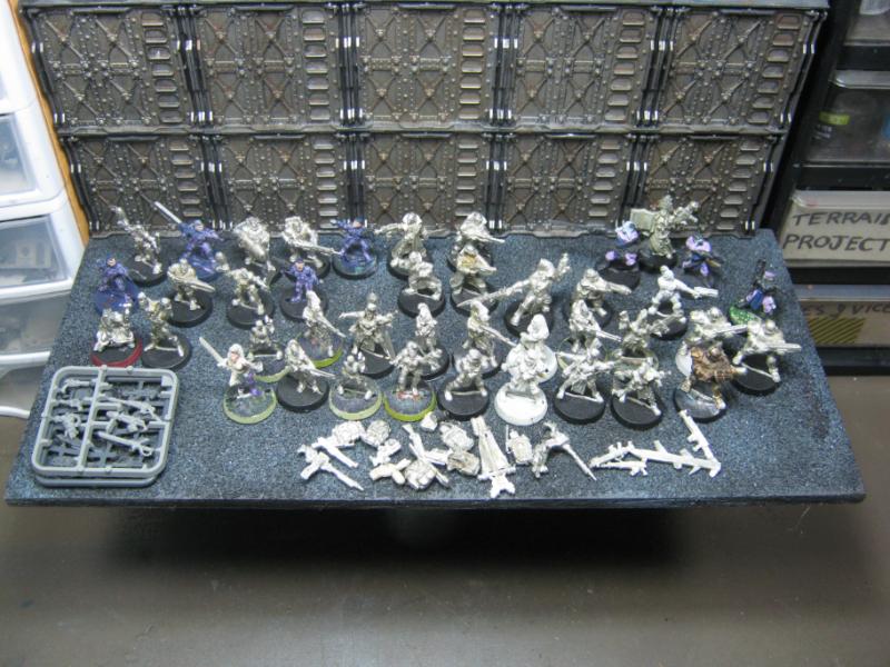 Wow. Thanks for the responses and interest! I'll be updating this thread as I can. So far nothing new to report, but I do have some cool stuff to share. Here's a glimpse of my past accomplishments and future endeavors. This (minus a few models that somehow eluded the camera) is my collection of Necromunda miniatures. A few have been included from the latest haul, but vast majority are from the 90's. If you've played for any amount of time you'll see a lot of miniatures here that you recognize.