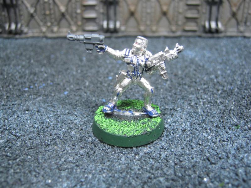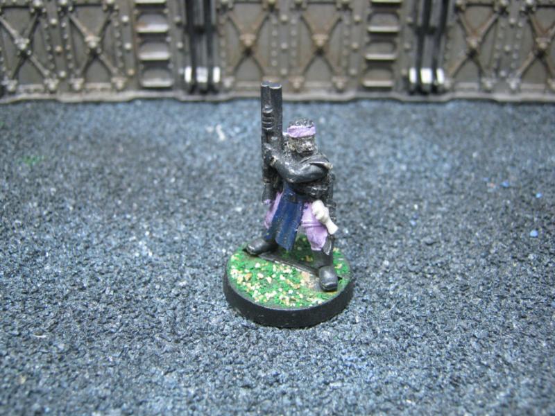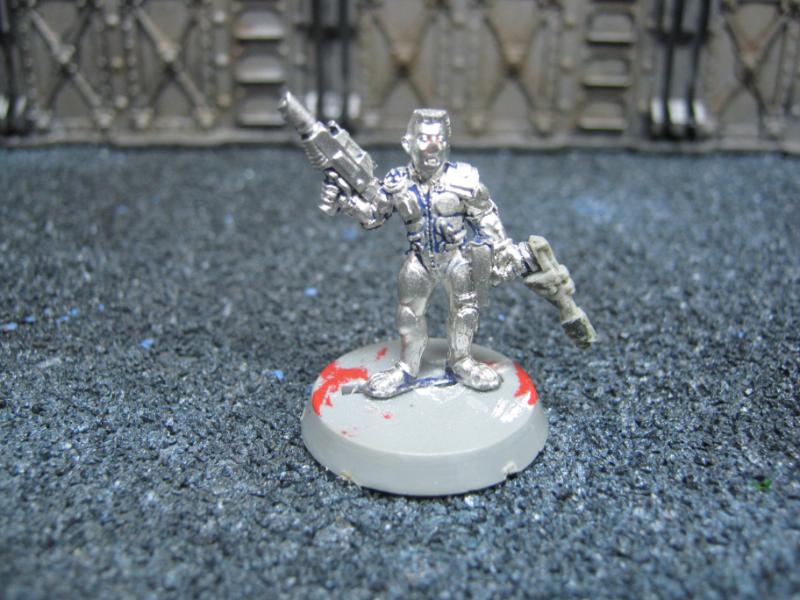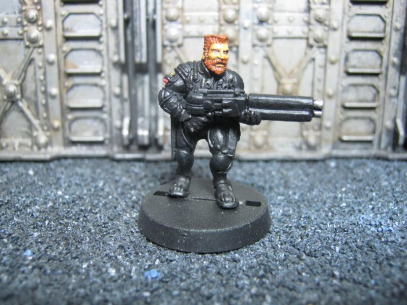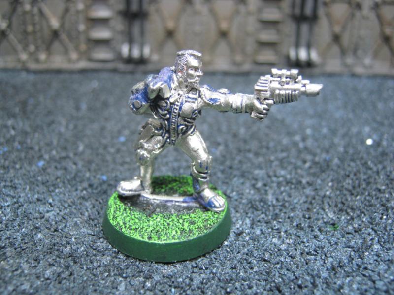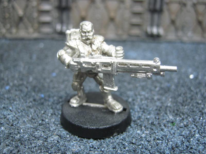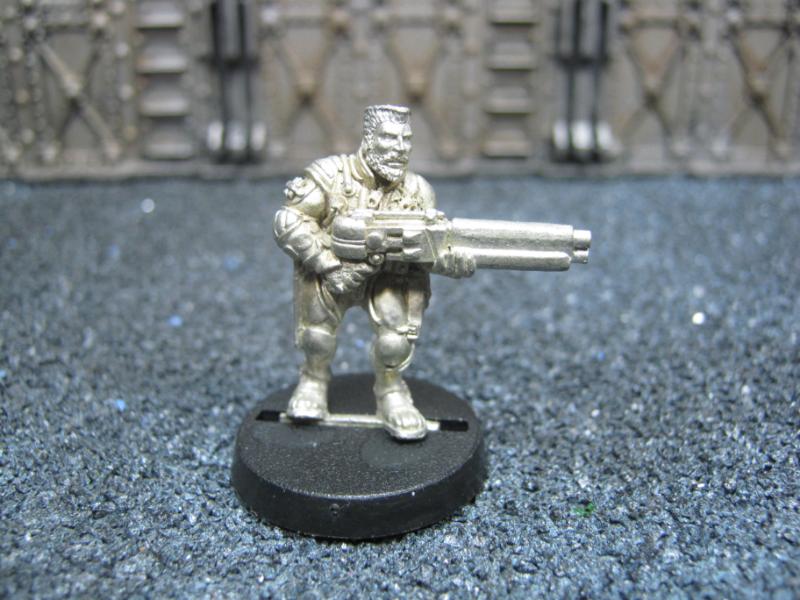 Now before anyone calls the Watchmen to have me run out of town for Heresy against a classic miniature, please know that the head was already missing when i got the model. Since he was already chopped up I removed the Chainsword to add the Bolter (from the original MK VII armored Space Marine set) so he could shoot further. And please note that I have a pristine copy of the same model just in case a Ganger develops awesome WS feats.