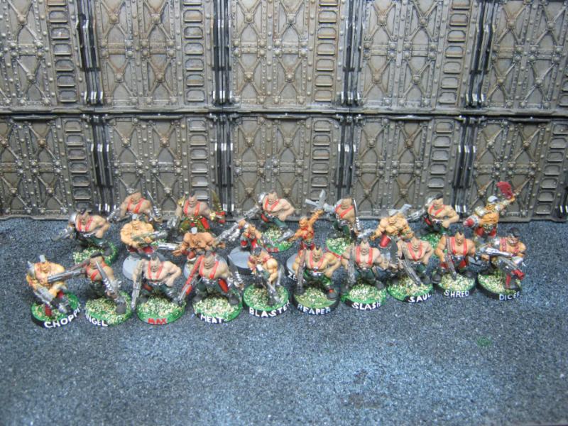 These Pit Slaves were the last gang I was working on before I stopped playing. I *really* enjoyed the conversions on this one. I was able to bring "useless" models (2nd Ed Space Marine Servitors) out from my collection and onto the table and play a gang that no one else was running. Even if I don't wind up playing them again I'd still like to finish painting this gang simply because it is just so cool. Far and beyond any comparison this gang has the most conversions of any other and has some humor to it as well (check the name and then look at the weapon... bonus to anyone that gets the rest of the joke). I really wish I had the opportunity to have played them more before things shut down, but there will be more opportunities ahead.