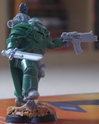 I filed down the back of the combat knife and made it look a bit more deadly, saw teeth at the back and an edge at the rear. The paper towel is going to be the battered remains of a squad banner (his old squad) in place of the customary Chapter/Legion symbol on the left pad. How I did it comes from our good old GS guru BCK's Log, Page 47