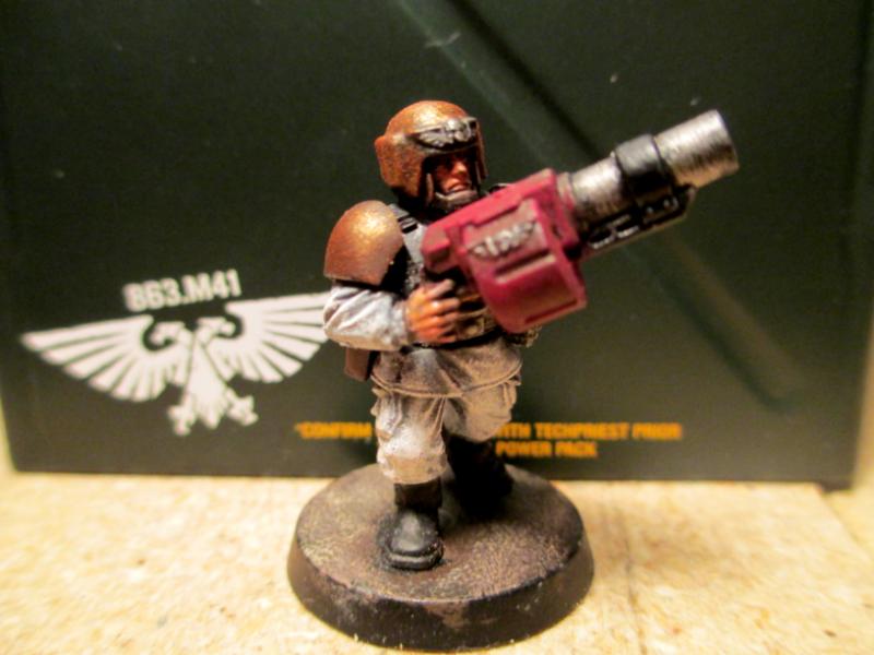 I'm working on a Storm Trooper Platoon. Still fairly new at this, but looking to create something that matches my friends' model quality. The current concept is bronze carapace, desert camo fatigues, and red markings on the hellguns. Other ideas welcome.