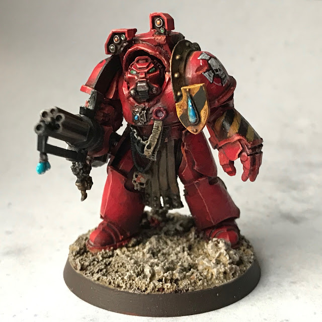 Today, here are my 'truescale' Terminators (a bit of an odd term these days, since all marines are now similar in size to the ones I converted), converted from the hulking Adeptus Custodes Aquilon Terminators. If you're interested in how they were done, there's a tutorial on the + Death of a Rubricist + blog.