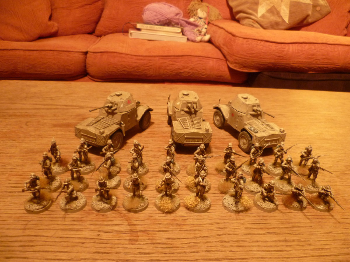 This is the core of the force. 3 infantry squads and their transports. This was my first time using a sponge to create a paint chip effect and I was fairly pleased with the results. The decals on the armoured cars are from the Warlord Games WW2 French line (along with a few from old 40k transfer sheets I have lying around).