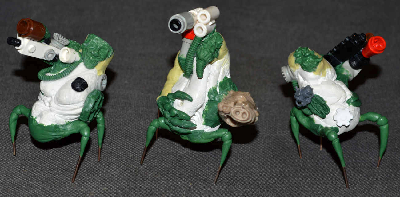 Latest arrivals here are the trio of centauroids I plan to use as Chaos Bikers. I can see a futuristic Beasts of Chaos type of theme emerging here. Glad I've got dozens of old and new Beastmen miniatures, horses, boars, more toy scorpions and other animals waiting somewhere. Also started scratch building a trio of Obliterator types back at home (no pictures taken yet). They are bloated blobs of flesh and Lego guns wobbling on thin legs. Yet to add or sculpt big heads on them.