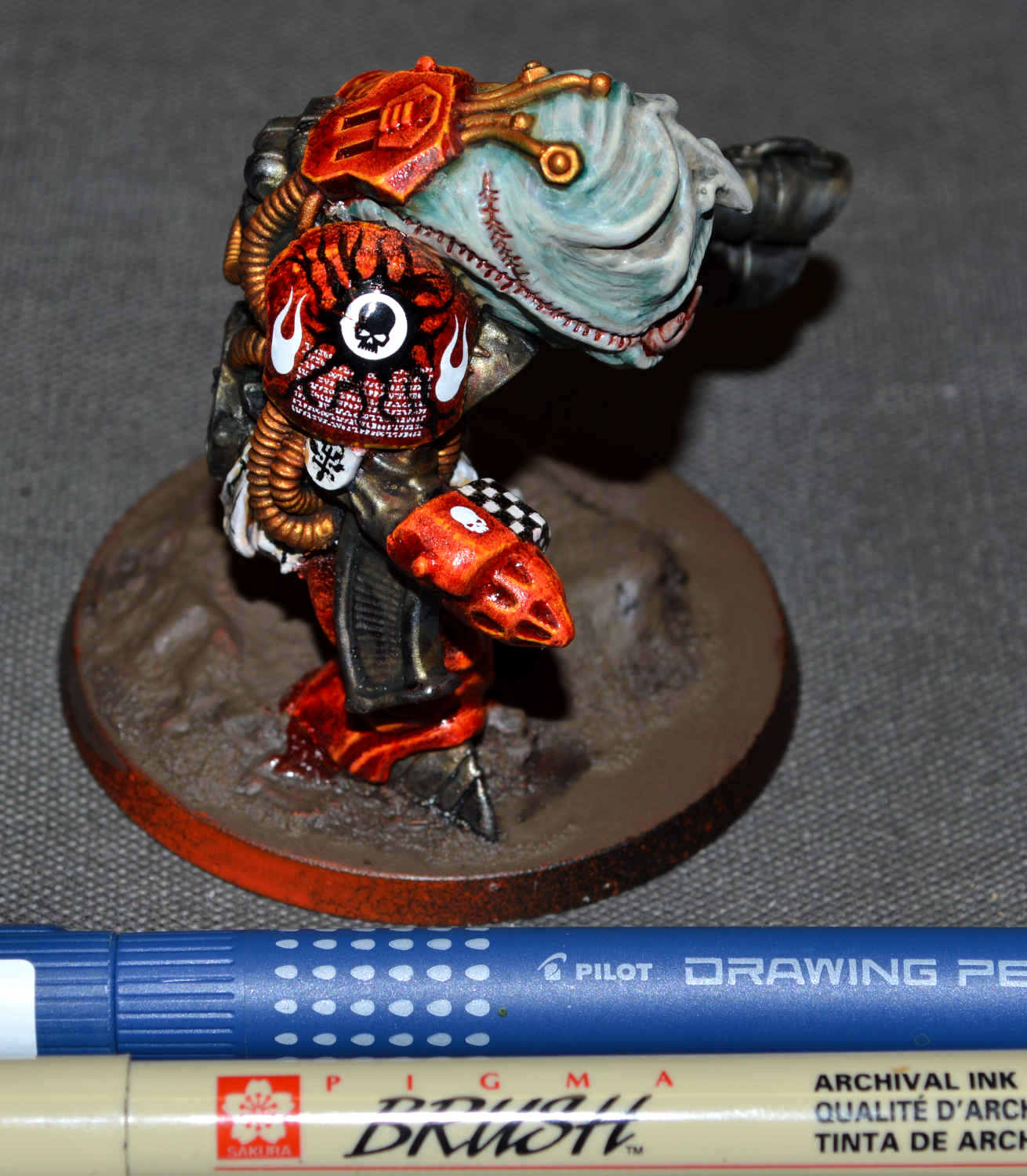 Primed with cheap Matt Black spray, with Army Painters Pure Red droplets sprayed on from above. Then I did touch ups with Matt Black and very rough overbrush with Pure Red on a few important looking spots. Red Tone wash all over, with Evil Sunz Red dots and splashes while it was still wet, to create kind of a marbling effect in places. Need to practise this more.