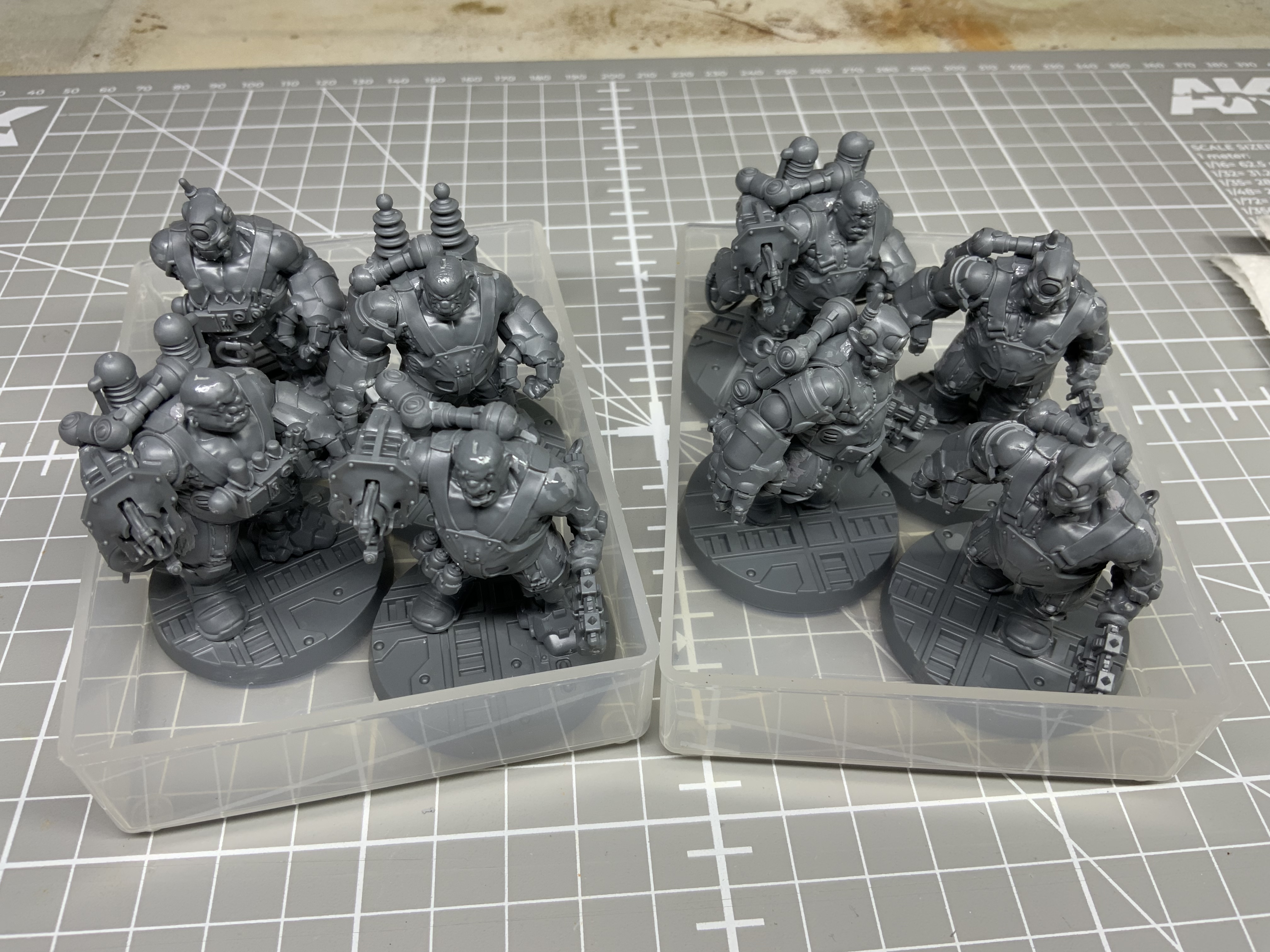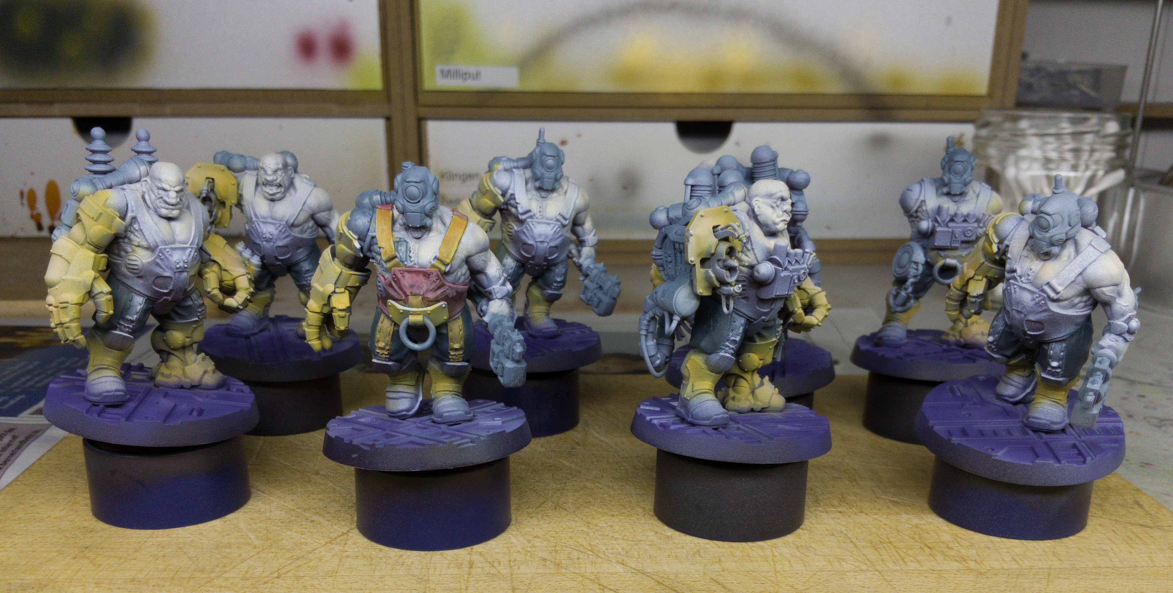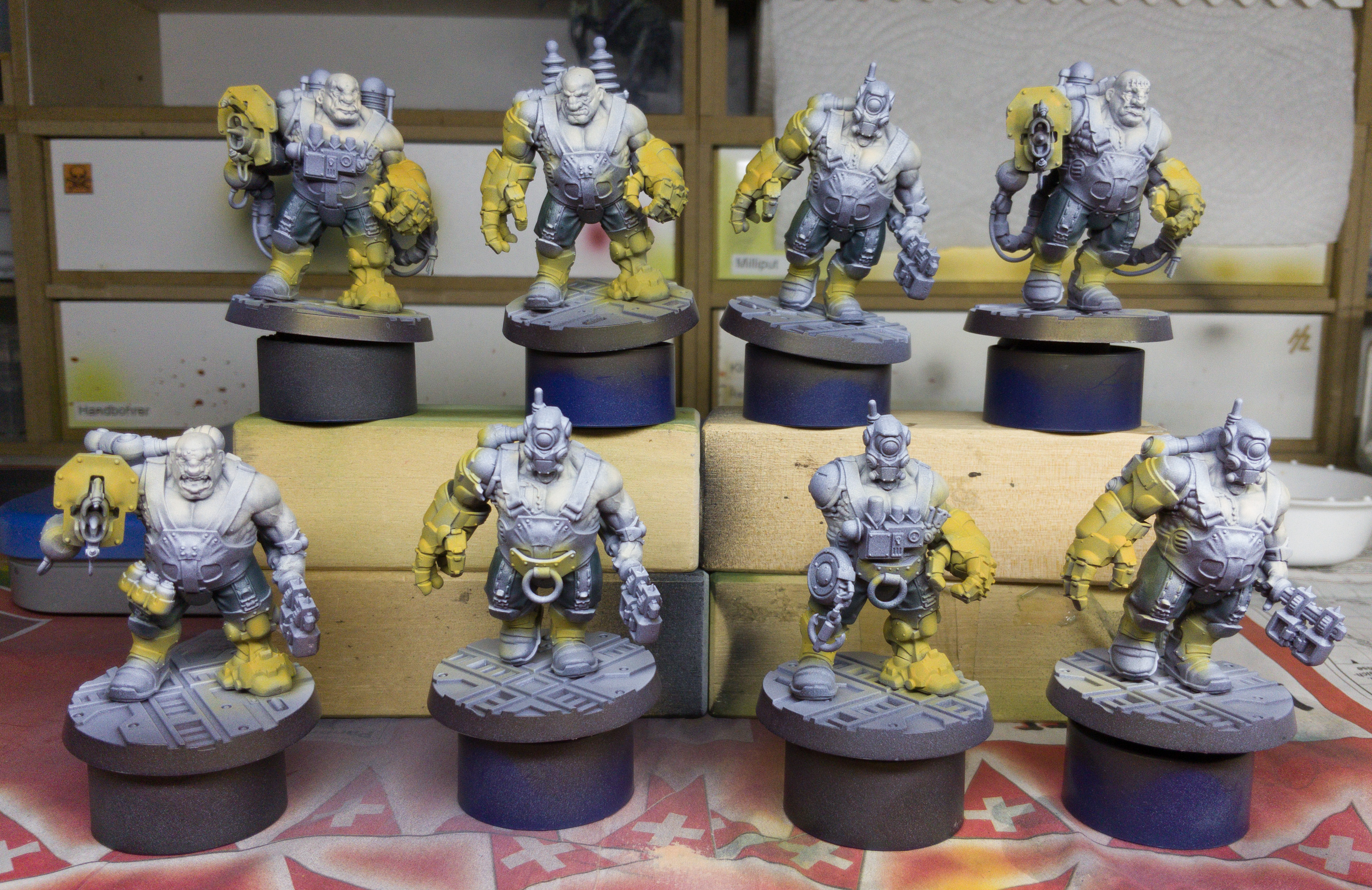 I airbrushed skin, armor and pants of all the Ogryns tonight. It‘s so hot and airbrushing was kind of a pain, I had to clean the needle tip every 10 seconds or so.