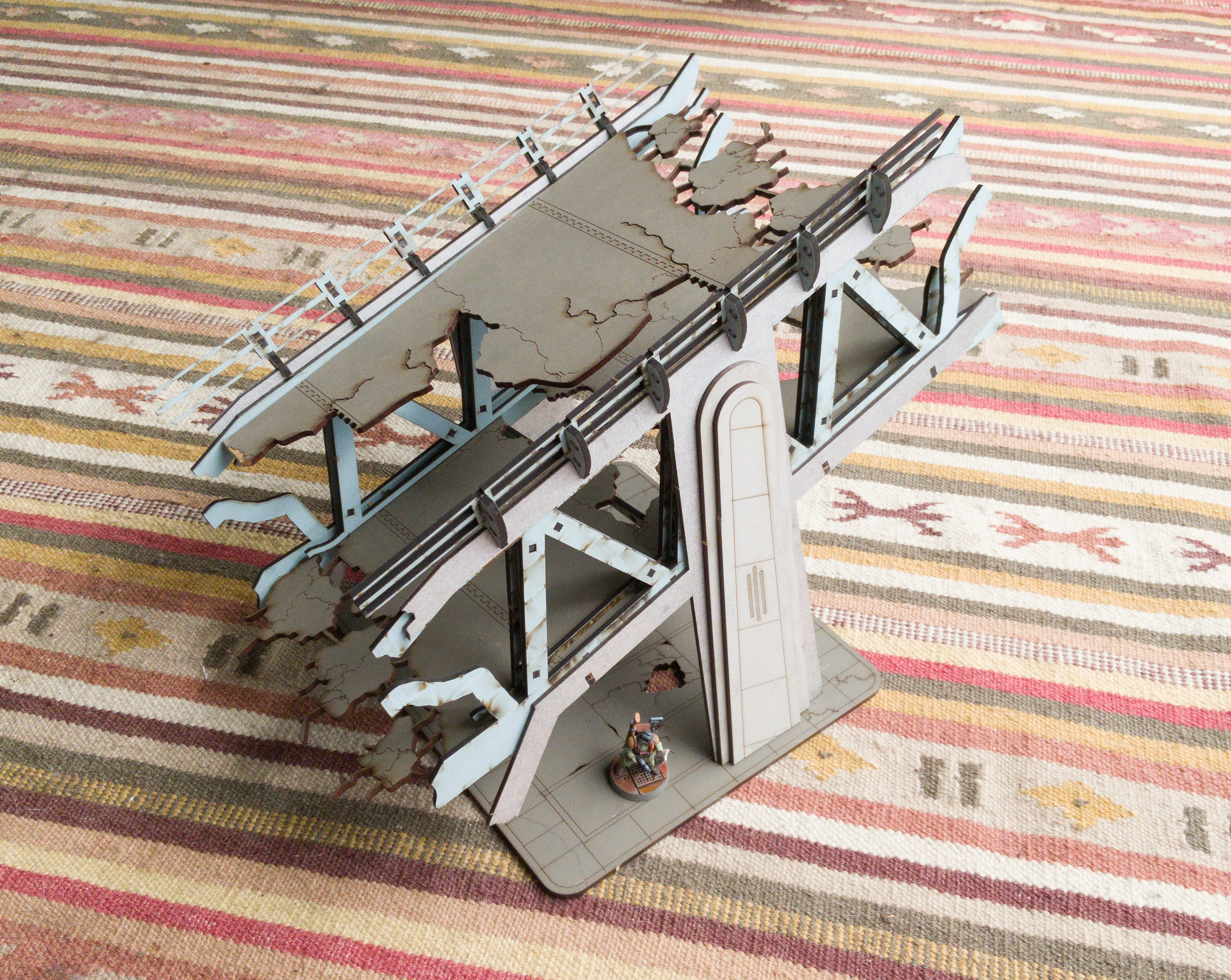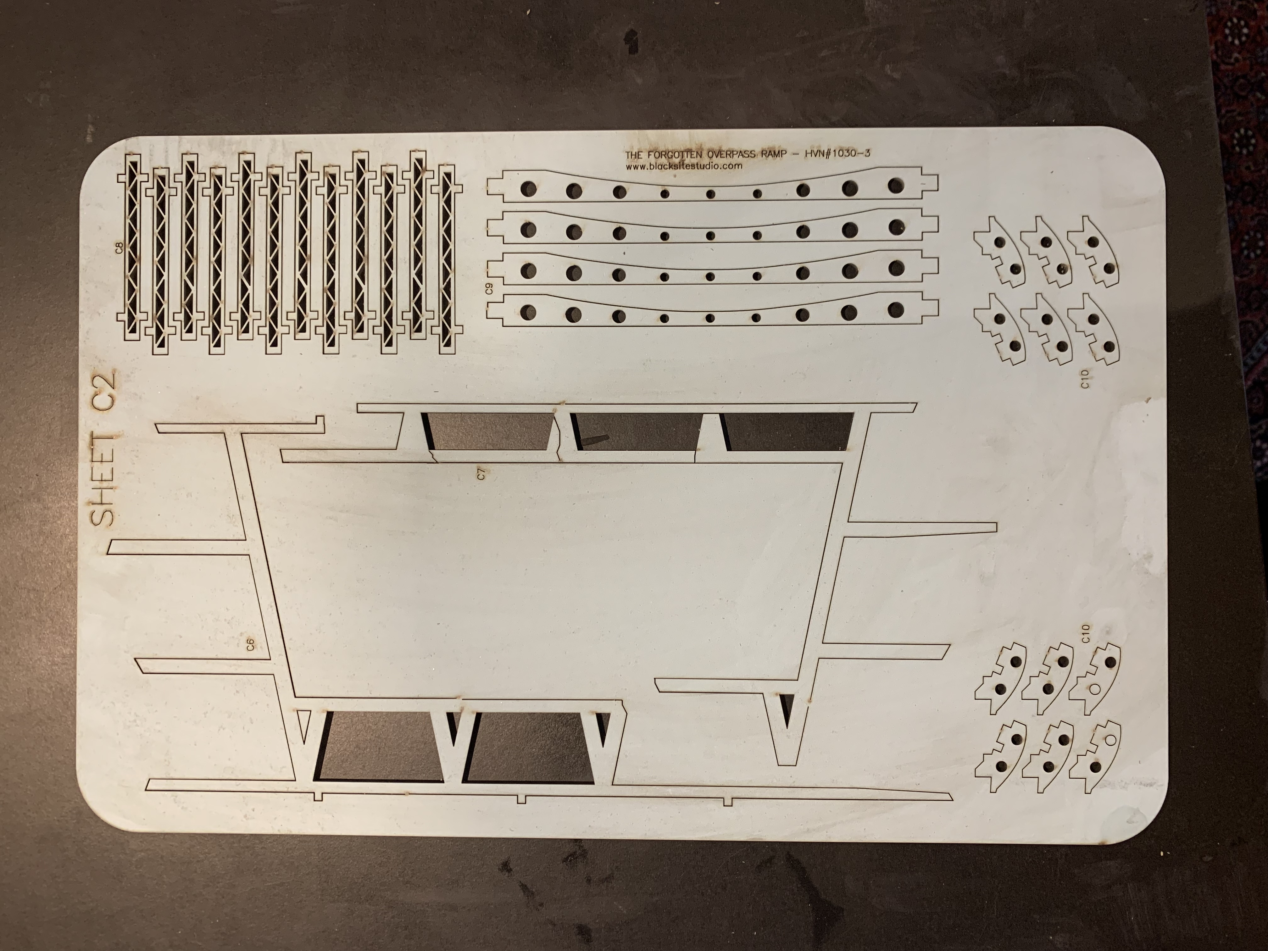 I got side tracked by a new mini quest: some post-apoc terrain for playing, for example Fallout Wasteland Warfare. This is one of three kits of a broken highway bridge. I assembled the first one: the overpass ramp. It's a heavy and big kit (imagine the shipping) and Blacksite Studios uses some really old lasers for cutting the thick MDF. Cutting the pieces out requires a lot of force and the cuts are not precise, so there's a ton of sanding and cutting. Blacksite kits also never fit, there's always something off and dry fitting everything is important as you don't want to start chipping away when everything is covered in pva. Also, they don't make good use of the "sprues". There's so much empty space here, where they could have easily added more stuff. Kind of a waste, really.