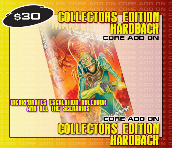 - We have created a Limited Edition Mars Attacks Hardback Rules Compilation – only available to Kickstarter Backers with a few available to round out the print quantity. This will be available as a $30 Core Add-on – but it will be included free with all pledges of $200 or more!