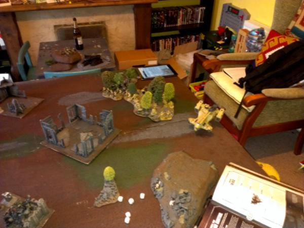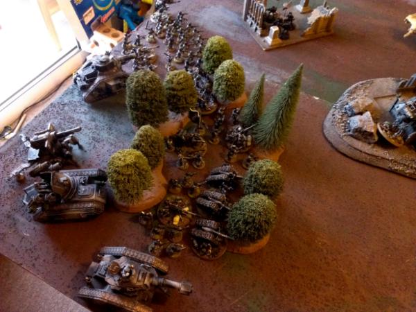 So I got the rulebook and the 2 Imperial Indices and started to write an IG list. I managed to fit in 92 infantry, 2 Russ, 2 Artillery and 3 Sentinels into 1.5k, 12 command points. I had a pile of little characters running around too. I got given Alex's loan set of old terrain. It's a bit battered and built for 5th ed but will make a fantastic start to having a home set up finally. I will do a few pics sooner or later. I also intend to recondition it and add to it too. Soon TM. MLCS lent me his folding board to put it all on and we actually managed to play an actual game. I only snapped off a few pics but he got a few more, if you want a look go over to his blog. It's just starting out and it is, unfortunately, about dirty, cheating, filthy, unsportsmanlike Tau but we can't all play Space Marines (apparently).