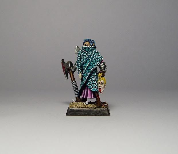 as this mini iwas one of the test minis in a series i'm callin' the $100 battlefield unit commander, i have to keep things fairly simple to make the painting time worth the paycheck...my basic skin formula is(i always prime w/ black) a base coat of bestial brown, then tanned flesh, 50/50 tanned flesh and elf flesh, pure elf flesh...if it is acually an elf i will then go up to 50/50 white and elf flesh...for the dead head, i went up to pure white so it looks like all the blood has drained away, and only painted the whites of the eyes so they look rolled back... i have since moved to a slightly different approach to metals, with black in the boltgun, for more contrast...darker is always better than lighter(especially for minis to look good in fotos)...