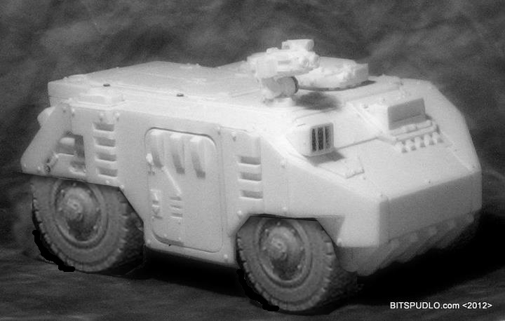 aka_mythos wrote:The wheels look too cramped. If you look at real wheeled armored vehicles the tend to have more clearance to better allow for wheels turning and bouncing. Visually the area on the rear just above the rear tire looks like it should be vertically thicker and thats a consequence of rear downward angled section starting maybe a little too soon from the centerline of the side than they might have wanted. Contributing to that cramped look is that the rear tire sticks out past the rear armor, when given the boxiness, it'd tend to look better with the armor coming out to the point where it's tangential to the rear wheel.