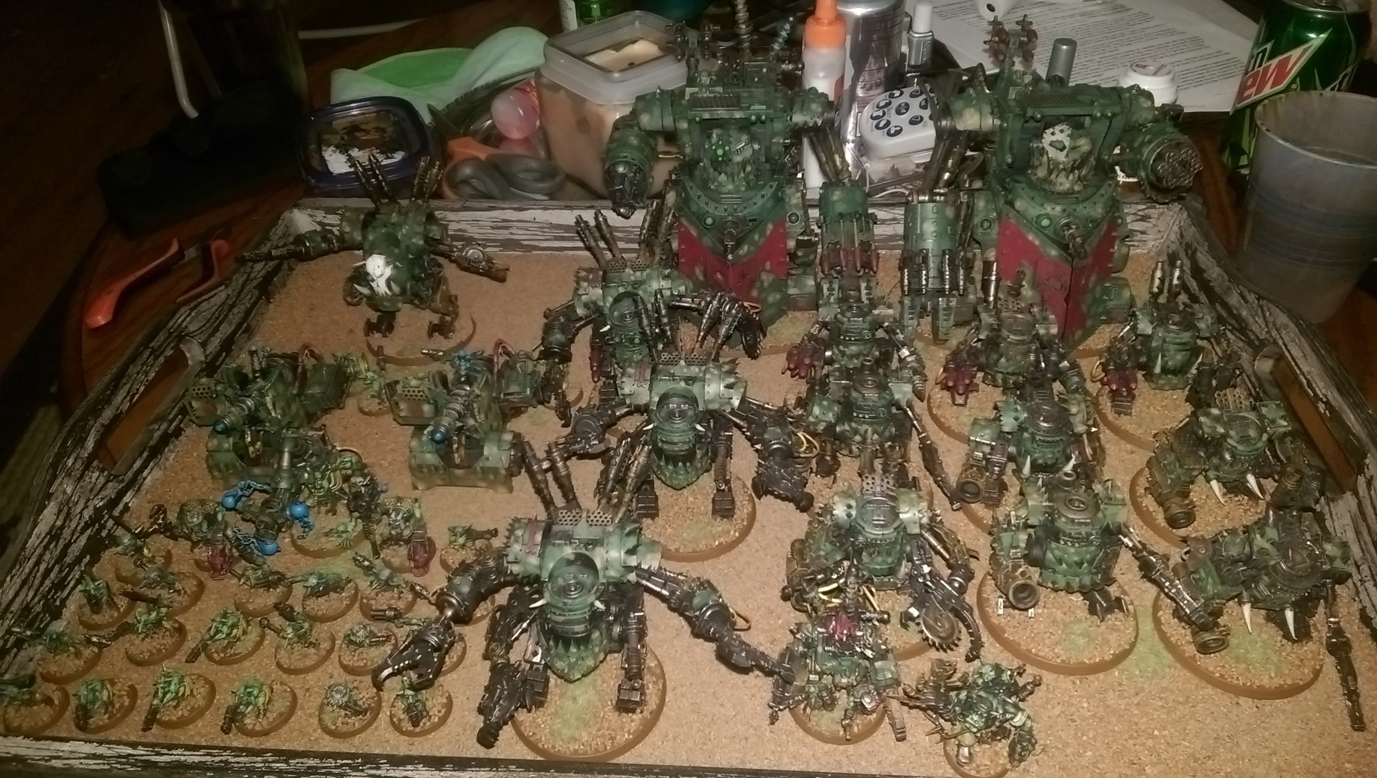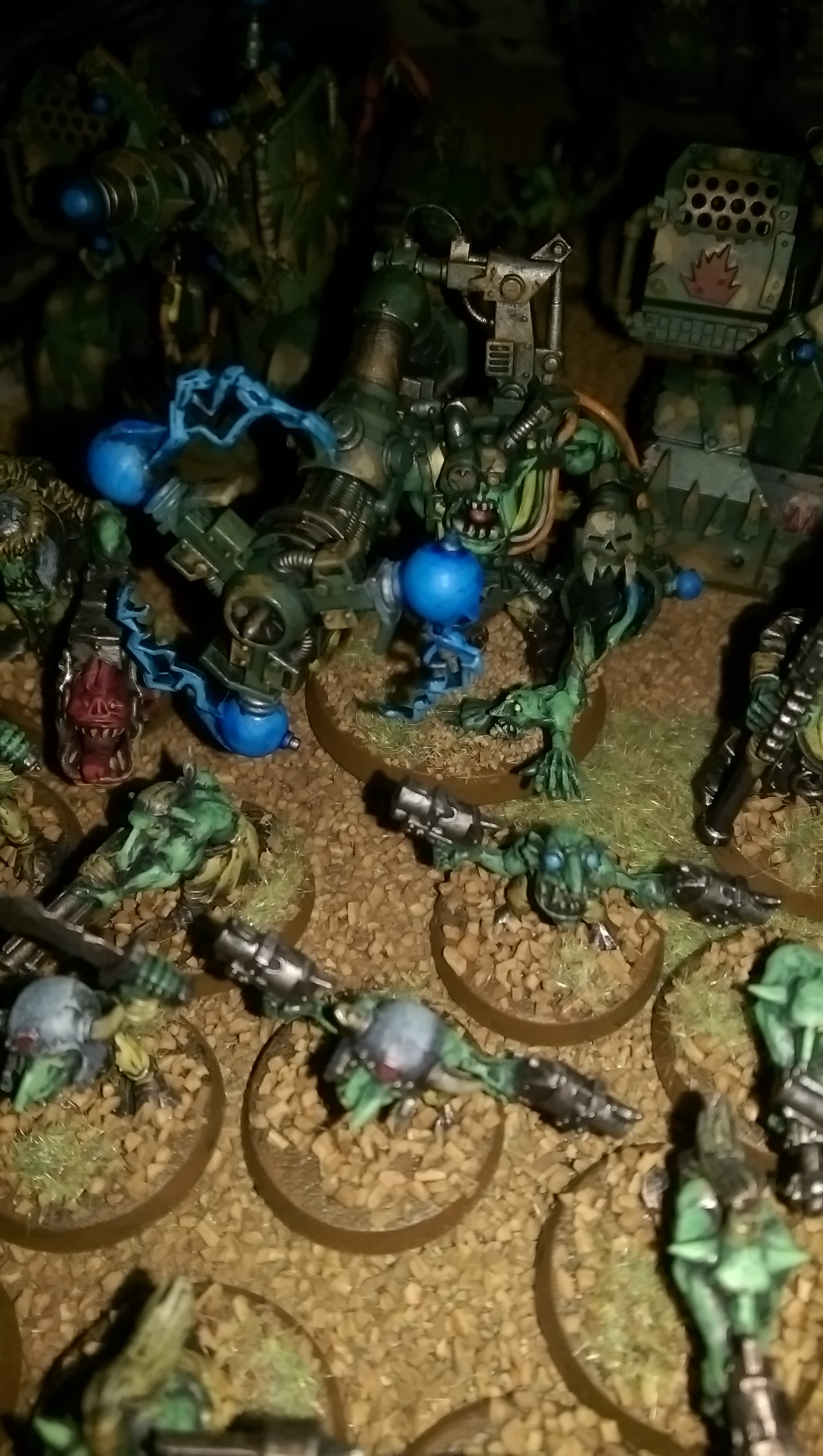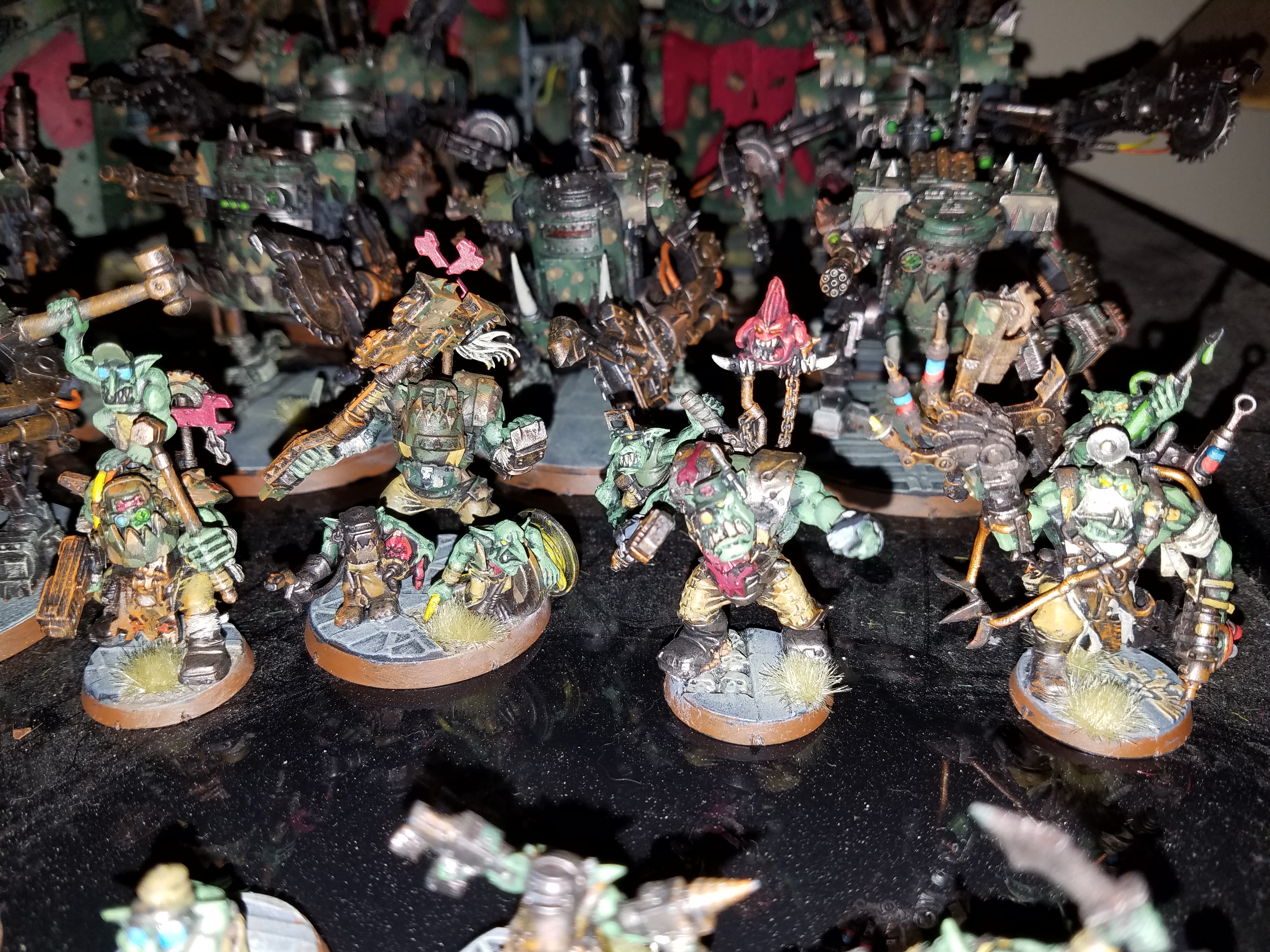 Have been touching up my Dread Mob and redoing the bases. Touching up a lot. These are my WIP/Finished shots. I've been slowly doing my grots to all be unique. I've been working on my Stompas lifta droppa arm, still touching up but much happier. 4 layers of yellows including wash and dry brush later....