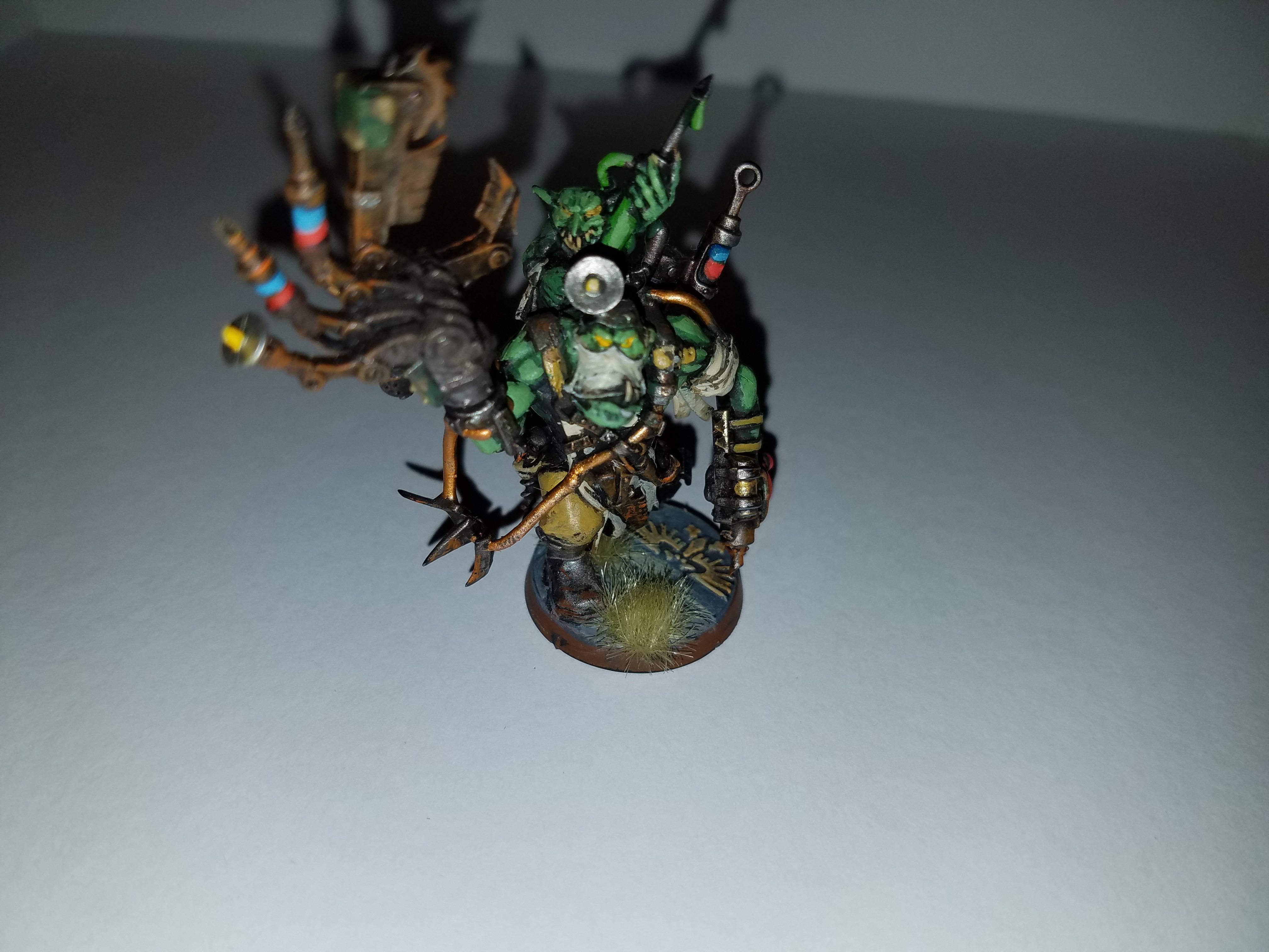 I wasn't happy at all with the Painboy model, bought the old school version and wife liked the old Painboy head and new Painboys body. I realized one of his fingers broke, not sure how that happened but made a second light for him! He's not very photo genic, his eyes look horrible in the picture, touched up the yellow and skin but group shot of my Meks and Painboy and then just my Painboy. Starting work on my display board now to match my bases. Have a local ITC tournament next weekend.