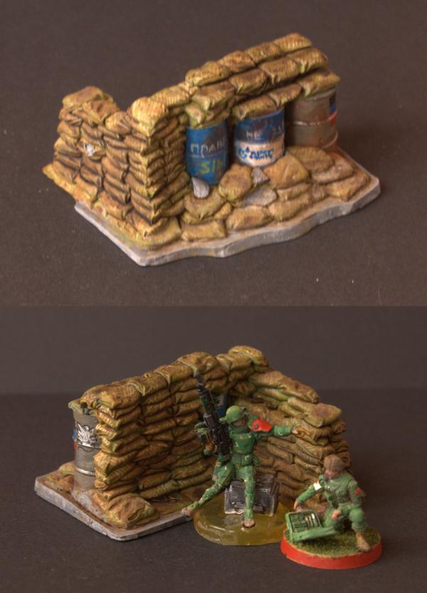 And on a sour note, I can't ignore the politics and stuff, so here is a little terrain piece too. Bought it long time ago, from Kombrig, I think. 1:35 resin base, which makes for grossly oversized barrels, but all in all - almost proper for Infinity or Deadzone. You can hide three troopers behind it and it would not look completely out of scale. Painted and dusted with AV model colors and pigments.