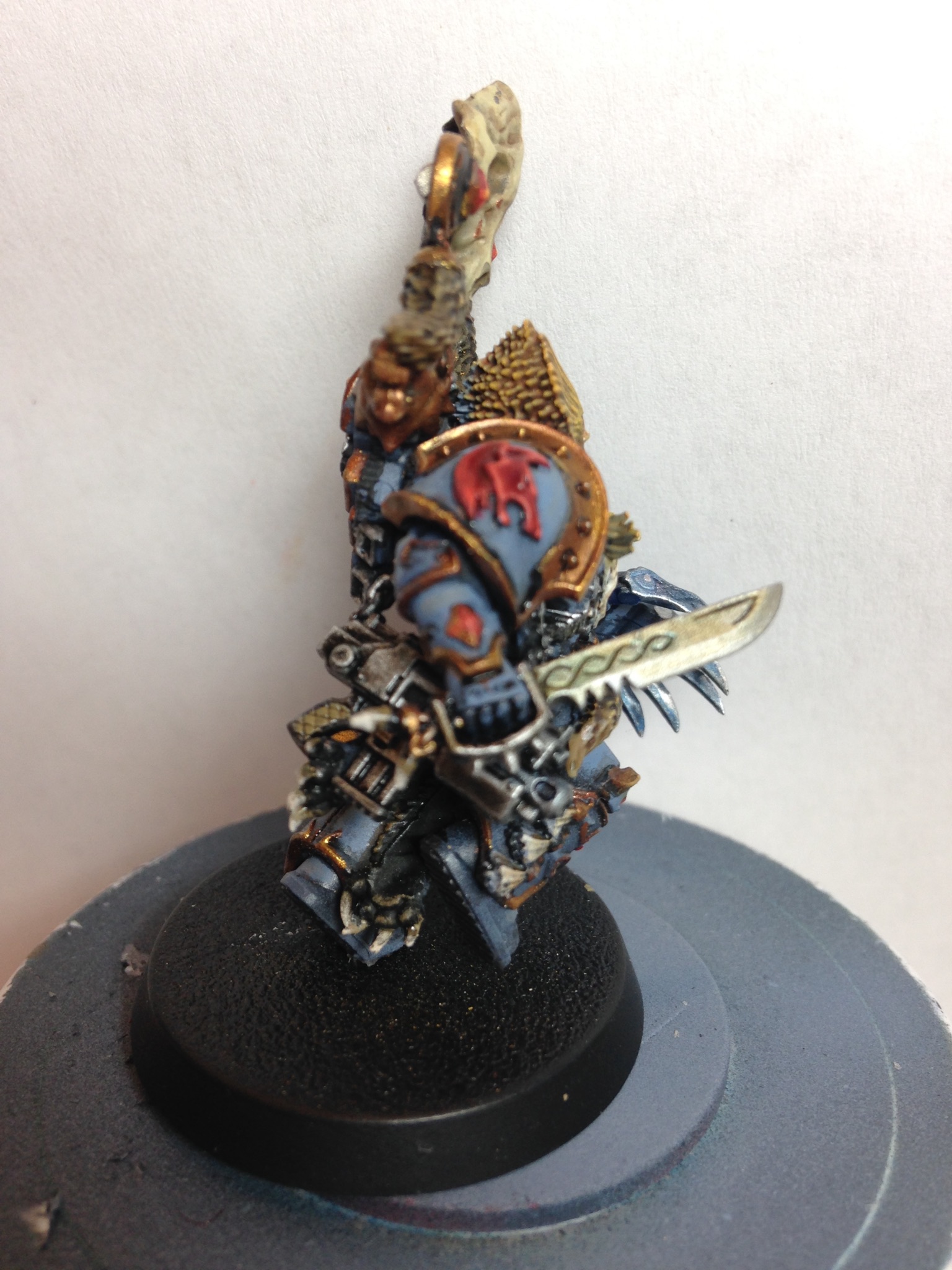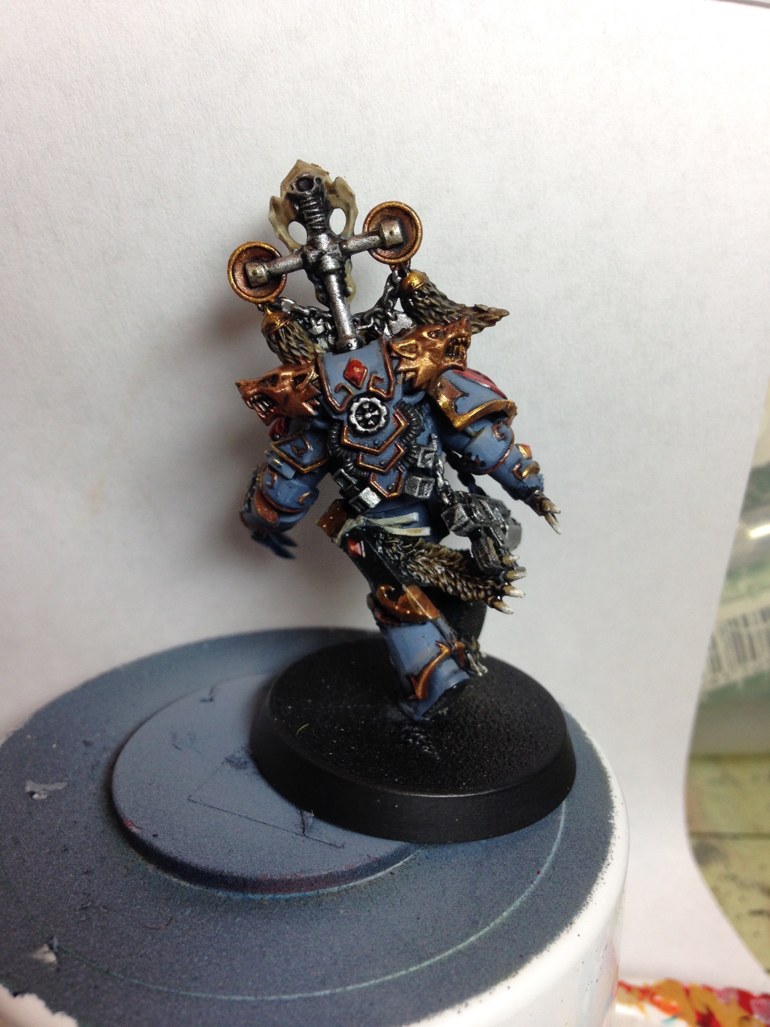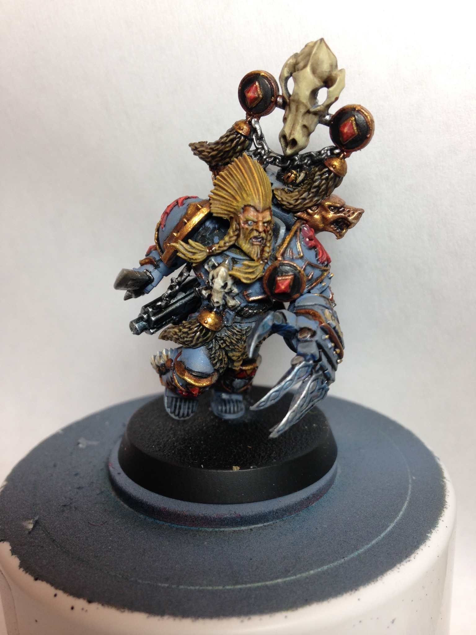 Trying my hand with the wolf lord from the prospero box. He is more gray blue than the picture shows, lots of details to pick out.