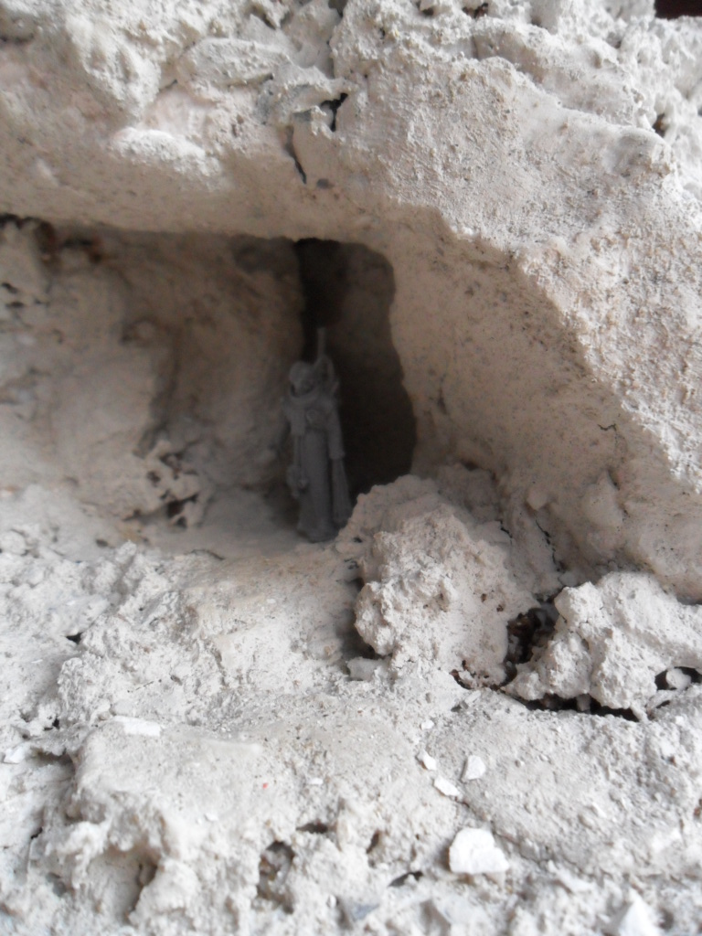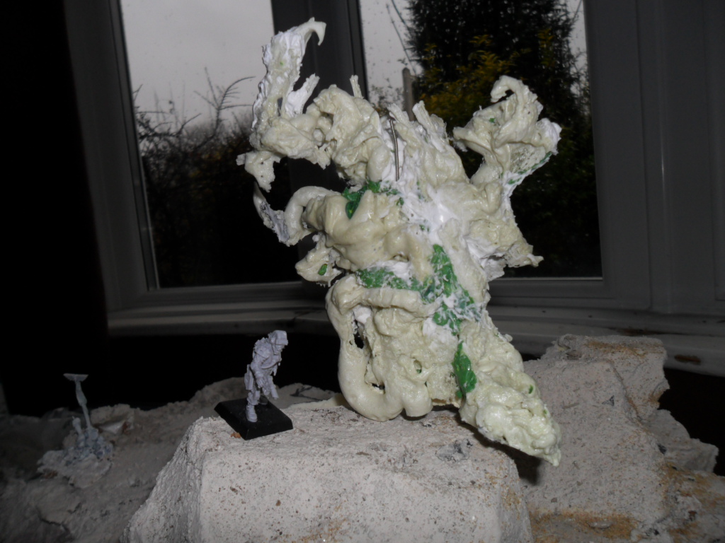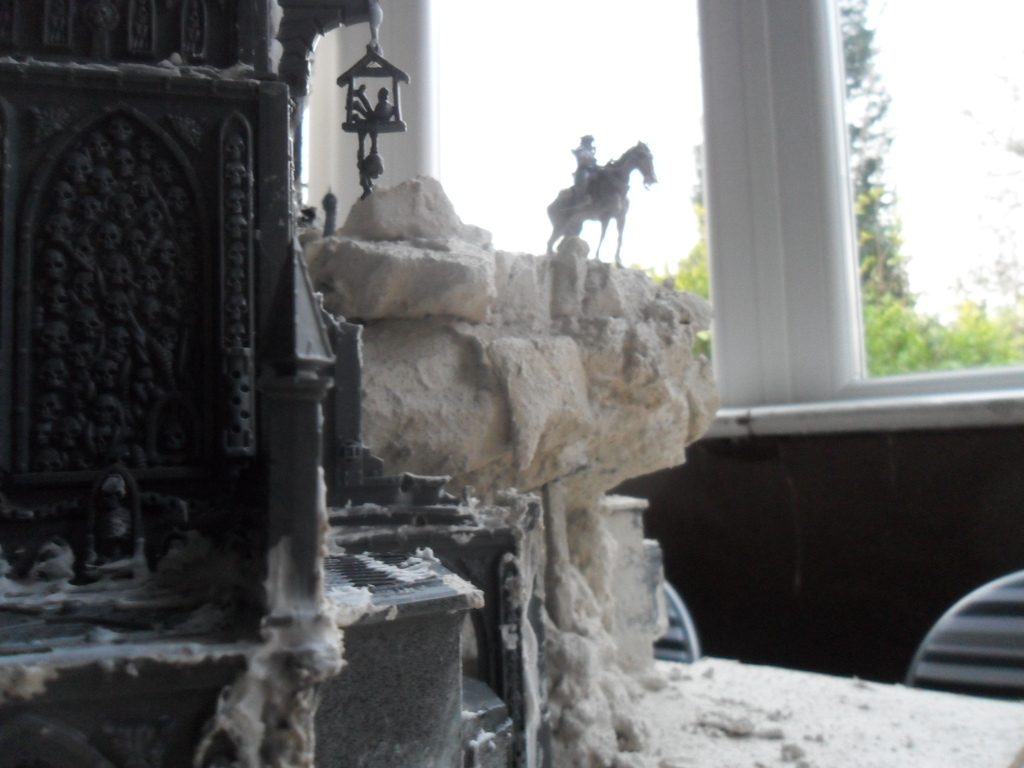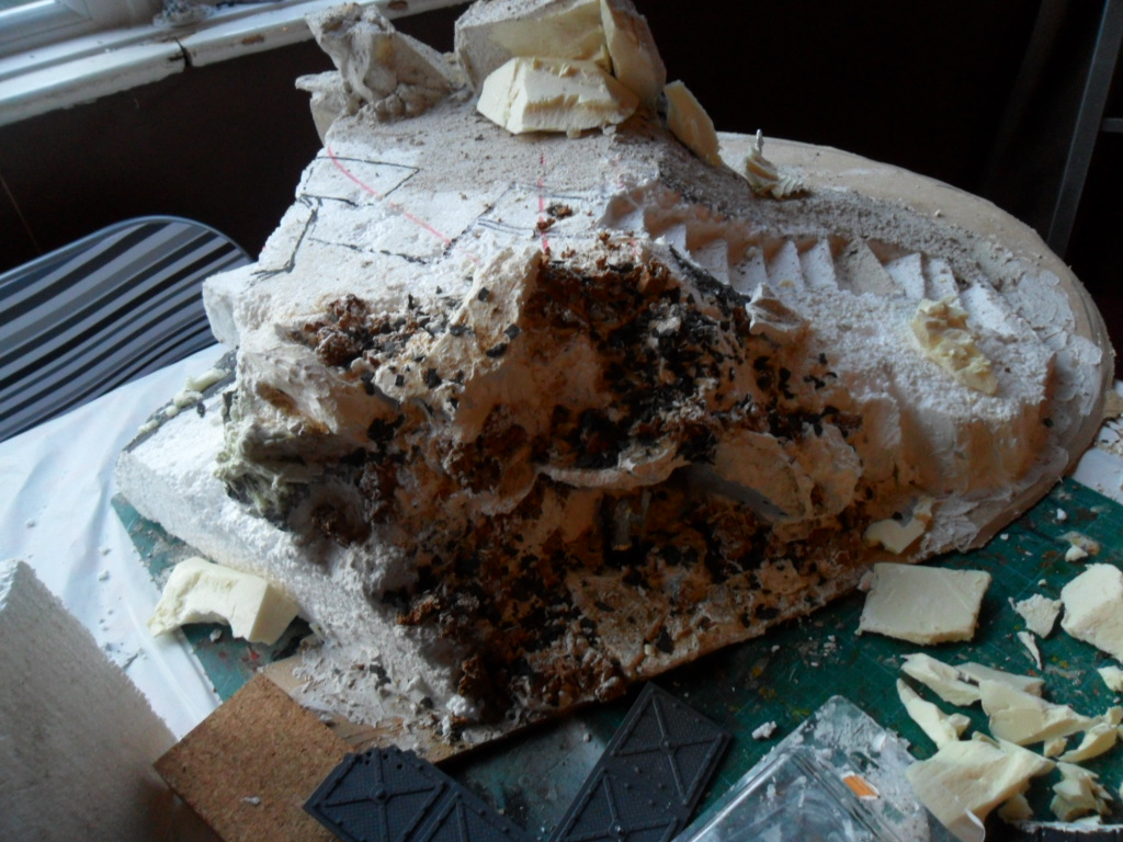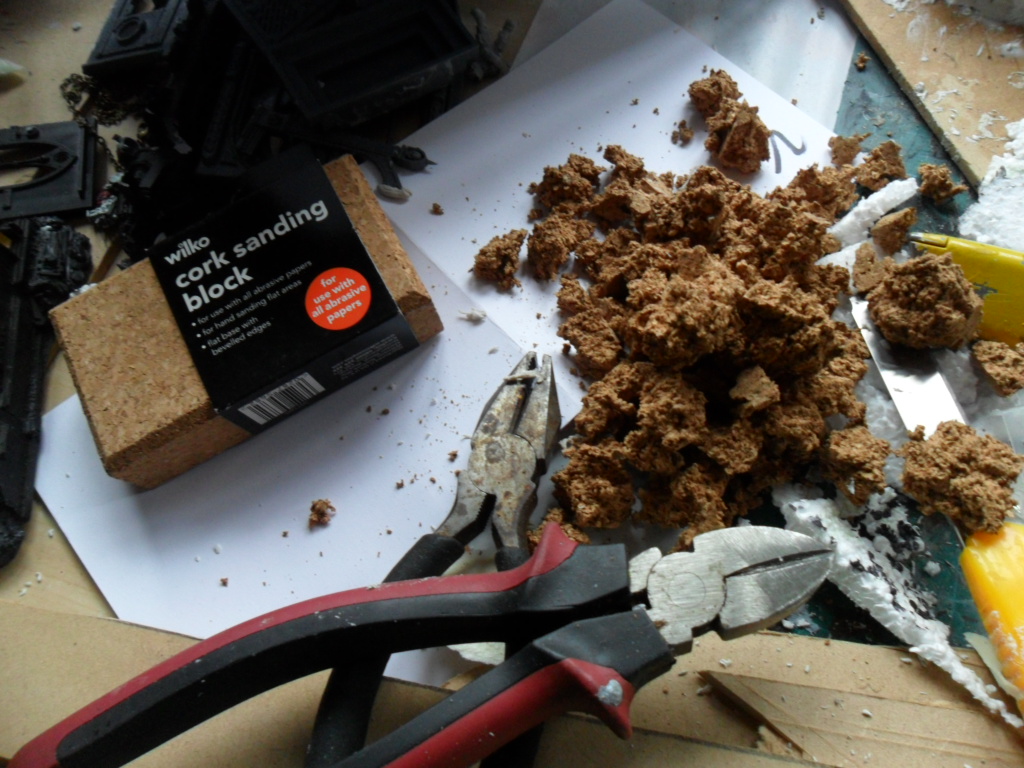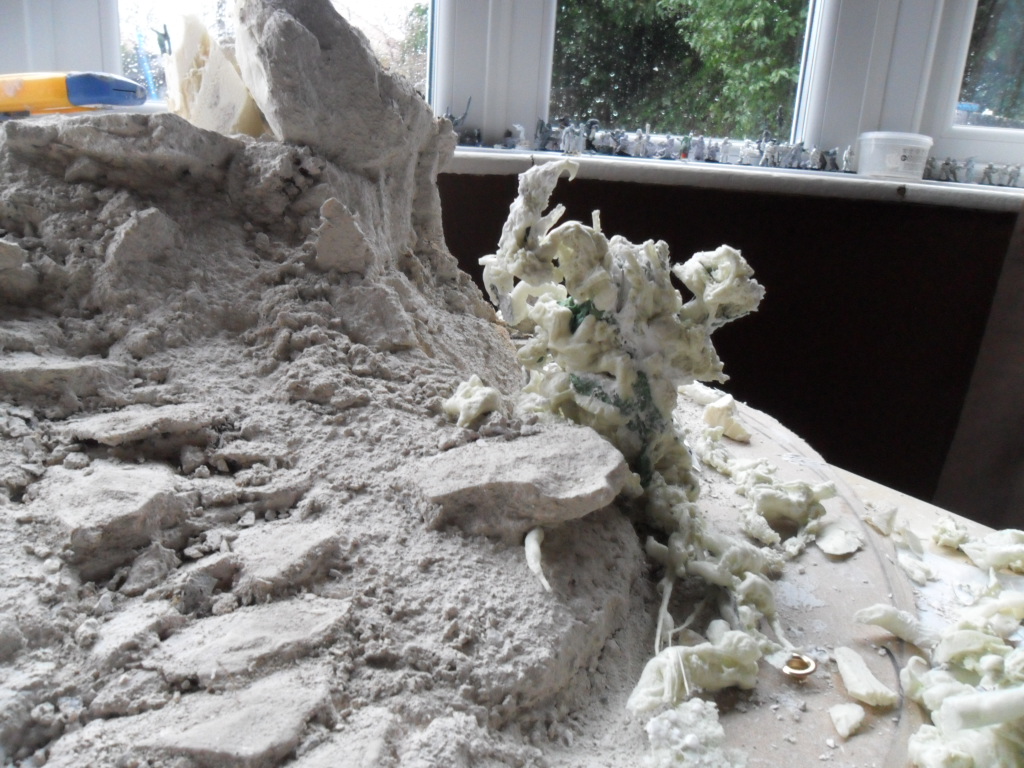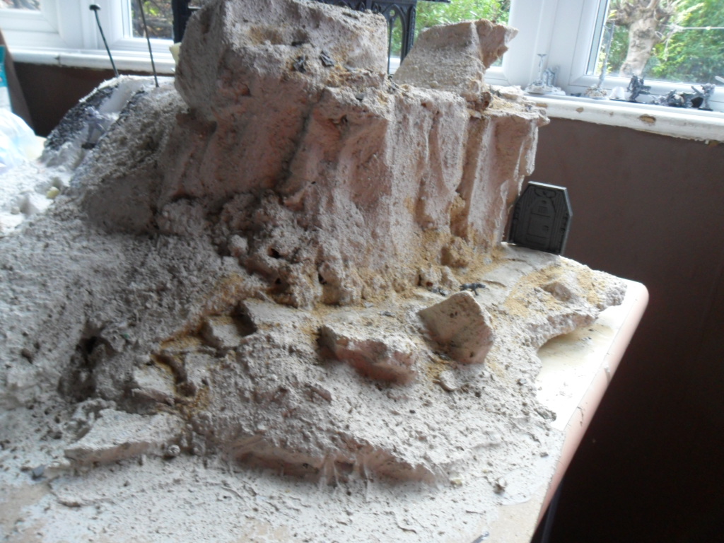 work is progressing at a pace , i stocked up on 12 bottles of liquid nails and now only have 1 left       picked up some cork sanding blocks for rubble and stripped some bark off my plum tree      i even stocked up on some extruded polystyrene at last !!     but the plaster of Paris casts are the best thing for this project, i made the cliff face first using just the yellofoam polystyrene  but it looks a little plain now i have completed the front steps and the side cave . ,the sleepy hollow tree and the graveyard , next, i made my own tombstones using the plaster of Paris , but the my squirty polystyrene foam tree failed     ,  too big and dominating will probably just pick up the citadel wood.