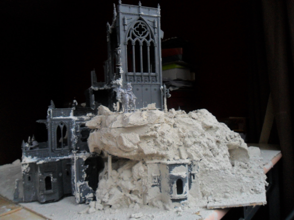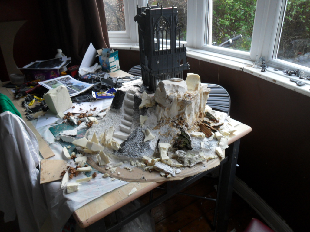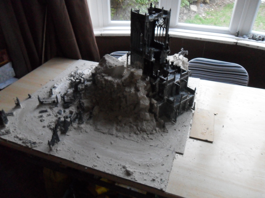Hey folks , i finished the build      finally , took a bit longer than originally planned ,  decided to go with the regular aquilla tower , and move focus of the build to the as yet unseen rear , as diorama , i was happy to only have the front and sides , but as i progressed i thought , bugger it ,this can be a gaming board too     so i added a few bits to give more regular gaming room and also to let the hill have a bit of breathing space , probably will add another flat  section for gaming purposes, i base coated all as one and will paint it all as one , but the boards are in fact separate  for storage ,as is the tower which is in two sections. painting next     effeminately going for a morning or moonlit winter theme , and picked up some woodland scenics for snow basing , looks like a great product.  was thinking of a vampirific blood red tower in a snowy white environment , but it might be a bit much      maybe just regular tower.