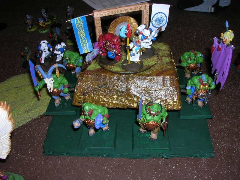 I like the general idea of the war altar a lot, and using Ogres to carry it around. The modeling is kind of improvised here. But it's definitely a novel idea that's worth taking as a starting point and running with. I like the inquisitor, too. One could try a similar approach to create a another concept for an arch-heretic: as evil, but hypnotically beautiful and seductive, luring his followers to enraptured worship and damnation. (Not really what you were going for, I realize. But again, a neat idea that's got me scheming.) Thanks for posting the pictures. Well worth sharing, IMO. edited: grammar