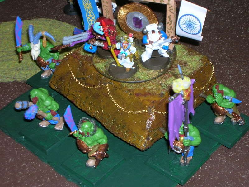 Lastly: the altar. I like it. It's a cool idea. However, I think that it would benefit from a couple of things. 1) Integrate the termie/marine/priest. As is they all look slapped together. Could you make the termie have a flamer instead of the axe and cut the marine all together?