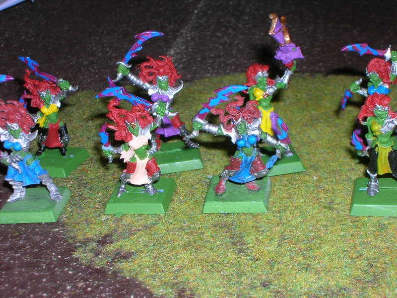 Fourth: Vengeances (demonette Cav). The throught is that these are avenging spirits. They are DE Cold Ones with greenstuff cloaks and blankets on the animals.   Lastly: Vengeances (demonettes). These are DE witches. The only conversion so far is one holding the head of a dead havoc. Mainly used as I like the models and they are PG vs the demonette models which aren’t the best when rugrats are running around “mommy why is that girl naked on the lizard?” Once I finish my two Leman Russ Vanquisher/Tiger II conversions over vacation, I’ll try to con Honda into photos of them as well.