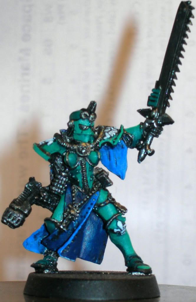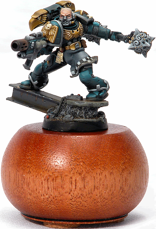 Here is a marine who did well in a Golden Demon competition (sorry to the original artist of the model, I'm afraid I didn't put down anywhere whose it was or what chapter it is), used turquoise really well with primarily gold and secondarily silver as contrast colours: