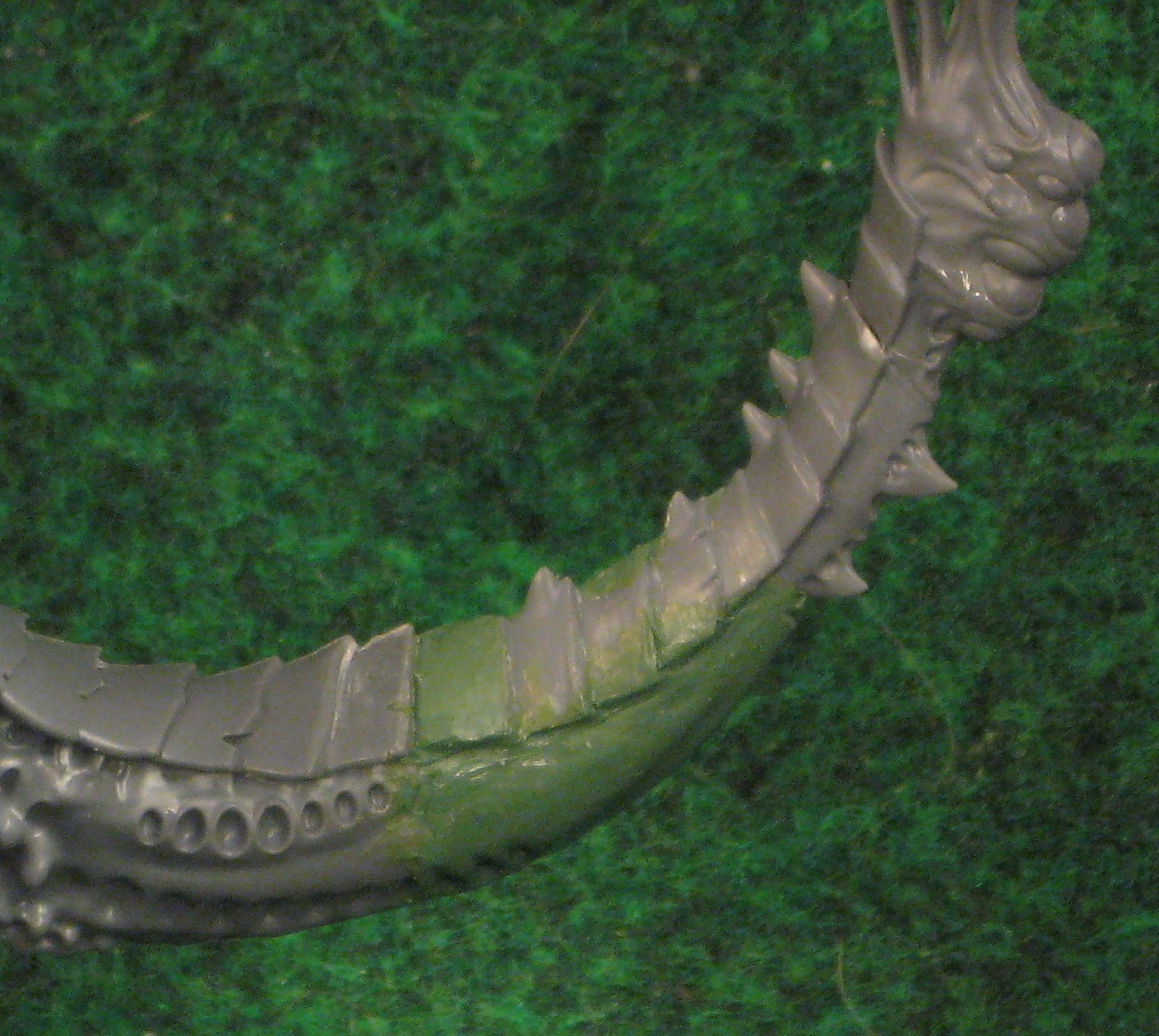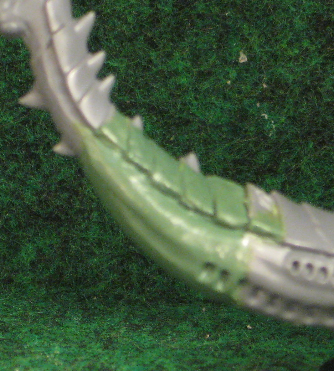 The tail continued to bug me as it was longer than I had wanted it. I figured since I couldn't do underside detail work, I could still work on the tail, as that's well overhanging the back of the base. Shorted it, and did some Green Stuff to try and smooth the transition. I think it came out pretty good, but I know I'll take a knife to it when it's hardened to sharpen some the edges a bit. As for the tip, that's actually the way it's supposed to go on. I might trade it out for the Trygon Prime's rattle tail tip though.