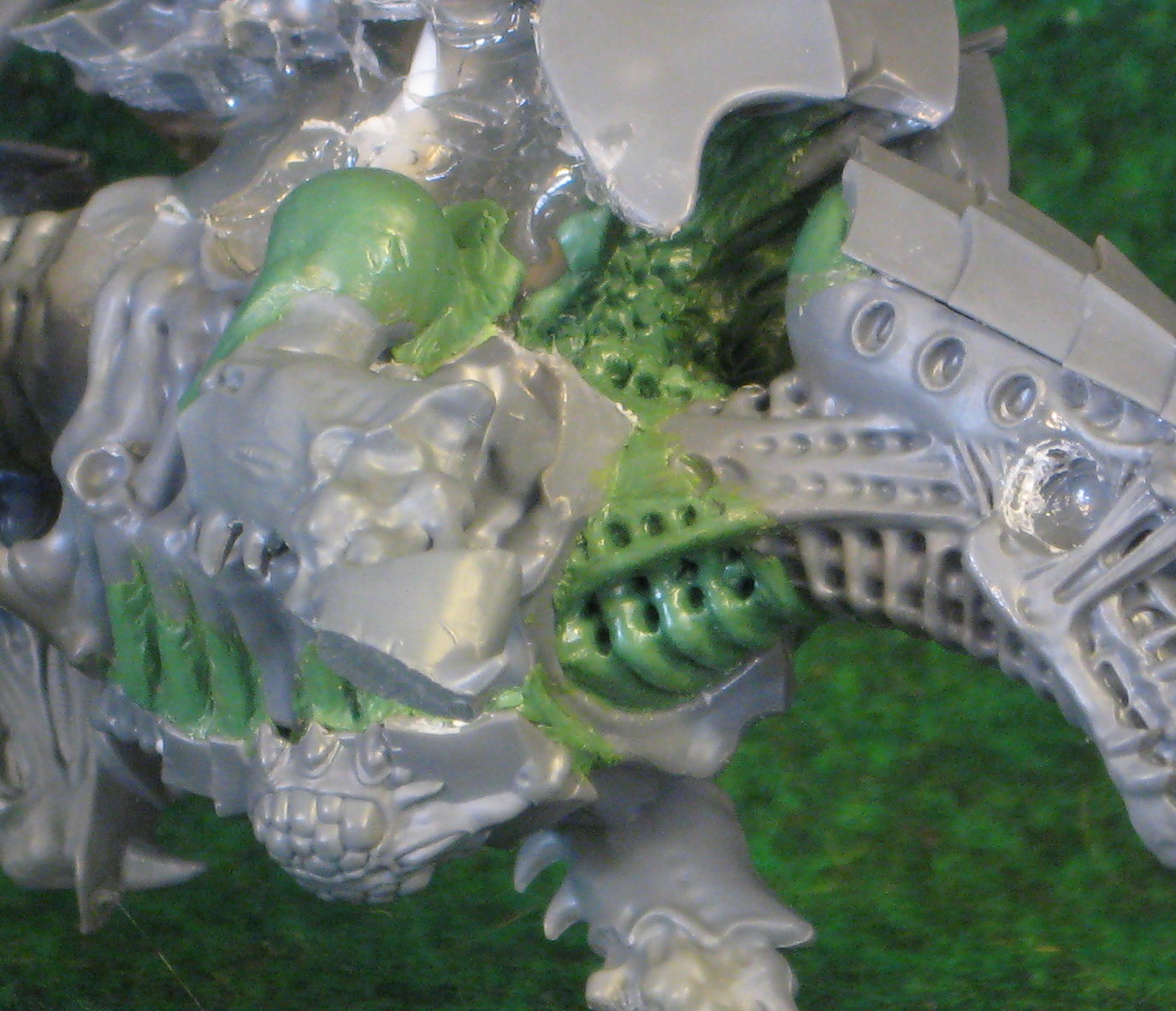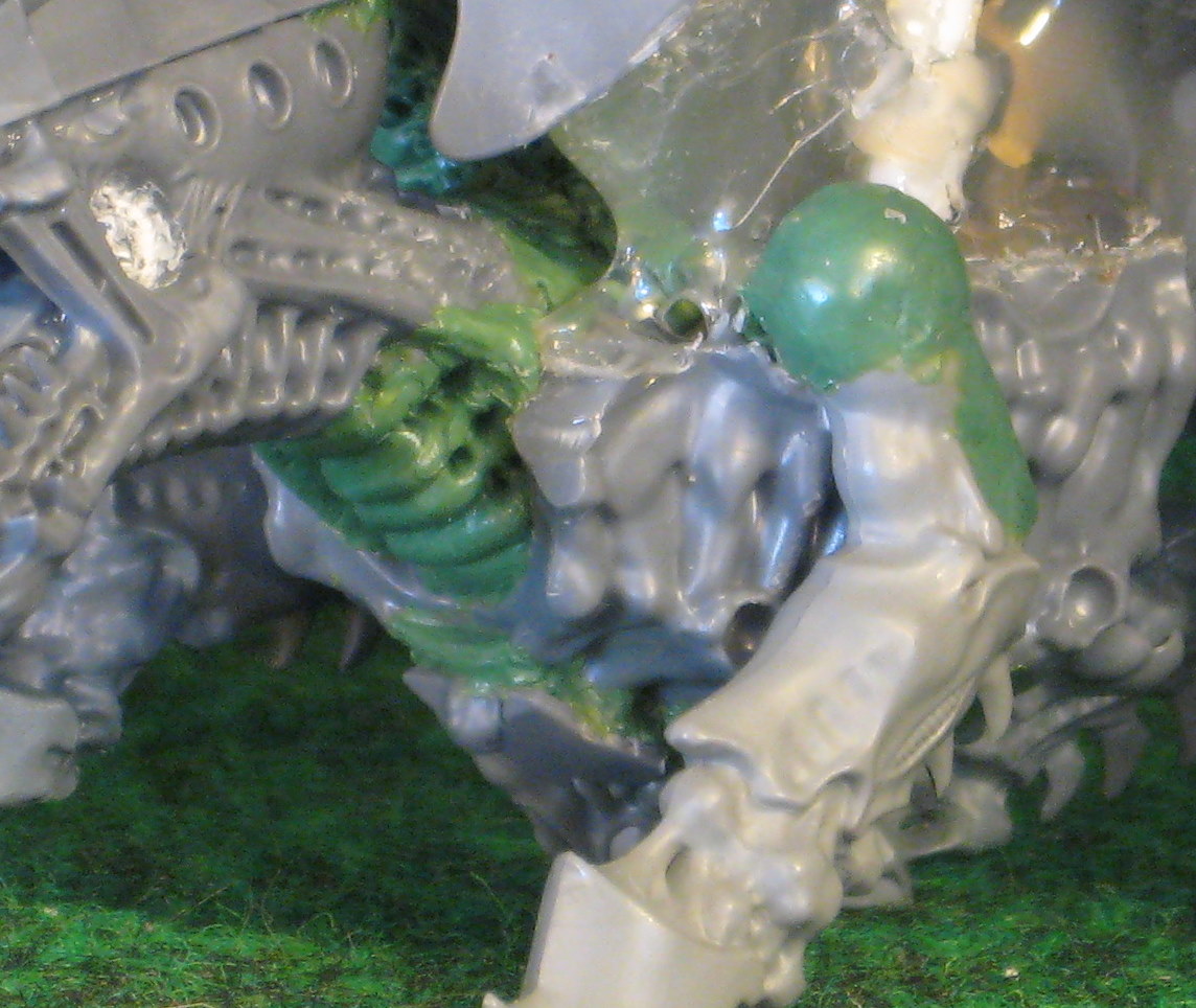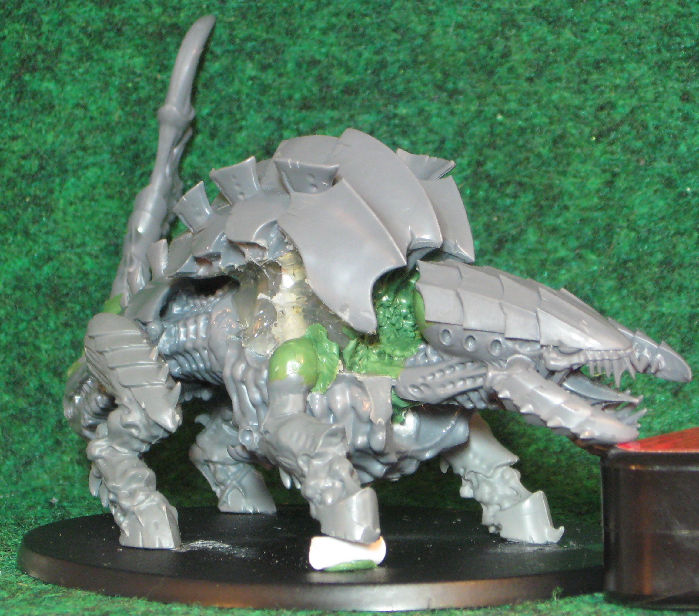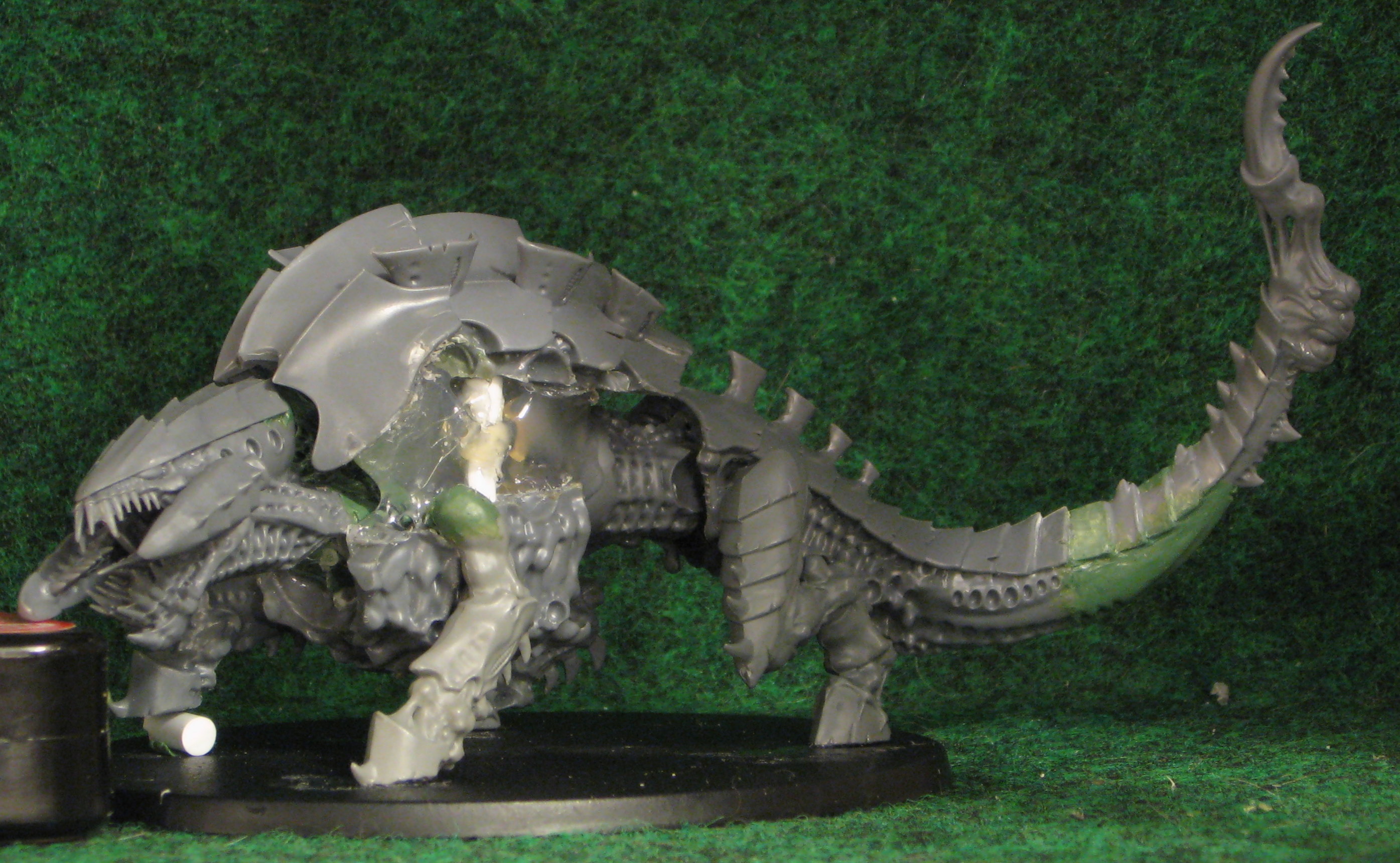 Just got back from the FLGS so no new pictures yet. The guy who was supposed to bring me the Crushing Claws I needed to finish his legs off was sick and didn't make it, so I bought a Carnifex so I could use those claws. Want to get his legs all done and secure tonight, maybe move his head, so tomorrow I can pop him off the base and get the underside done. I want to have this Done before the end of Saturday so I have it fully finished for the tournament on Sunday.