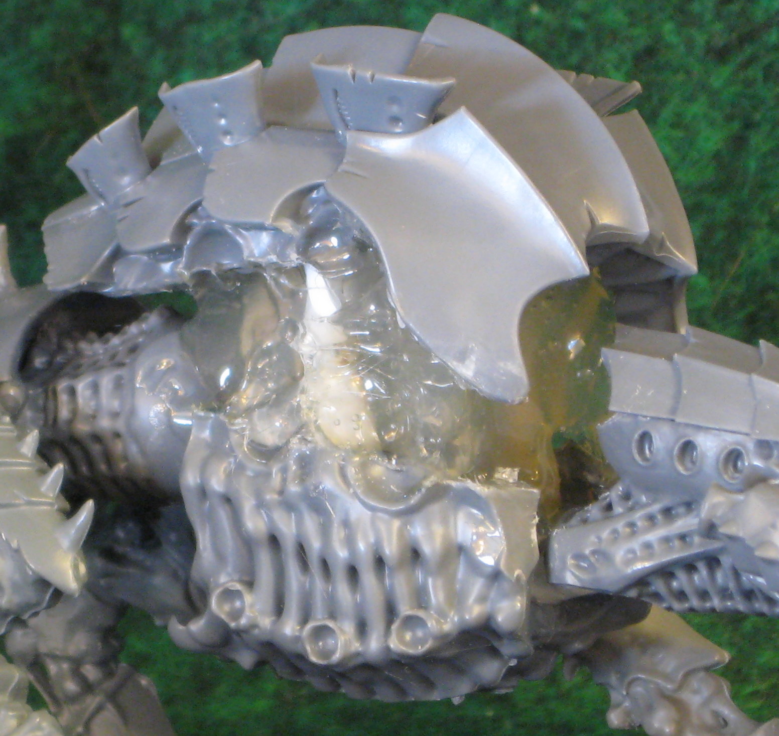 Not only were his "hydrolics" incredibly flimsy as structural support (the third rod didn't actually end up touching anything, the top just happened to balance perfectly on the first two), but I'm not willing to use that much Green Stuff to fill in all the empty space. Thus I came up with this when I did my GUO one awhile back. Hot Glue has a pretty quick set time (especially when it's 20 degrees and windy outside and I can set it on my porch railing), is much cheaper than GS, and has a handy nozzle application device. Need to work it slow, applying a bit and letting it cool before applying more. Put too much in at once and the Hot Glue will contain enough heat to do what it did to the carapace on the back of Tervie. Not to mention the burns I've gotten in the past from accidentally missing my target and spraying the glue directly onto my finger.