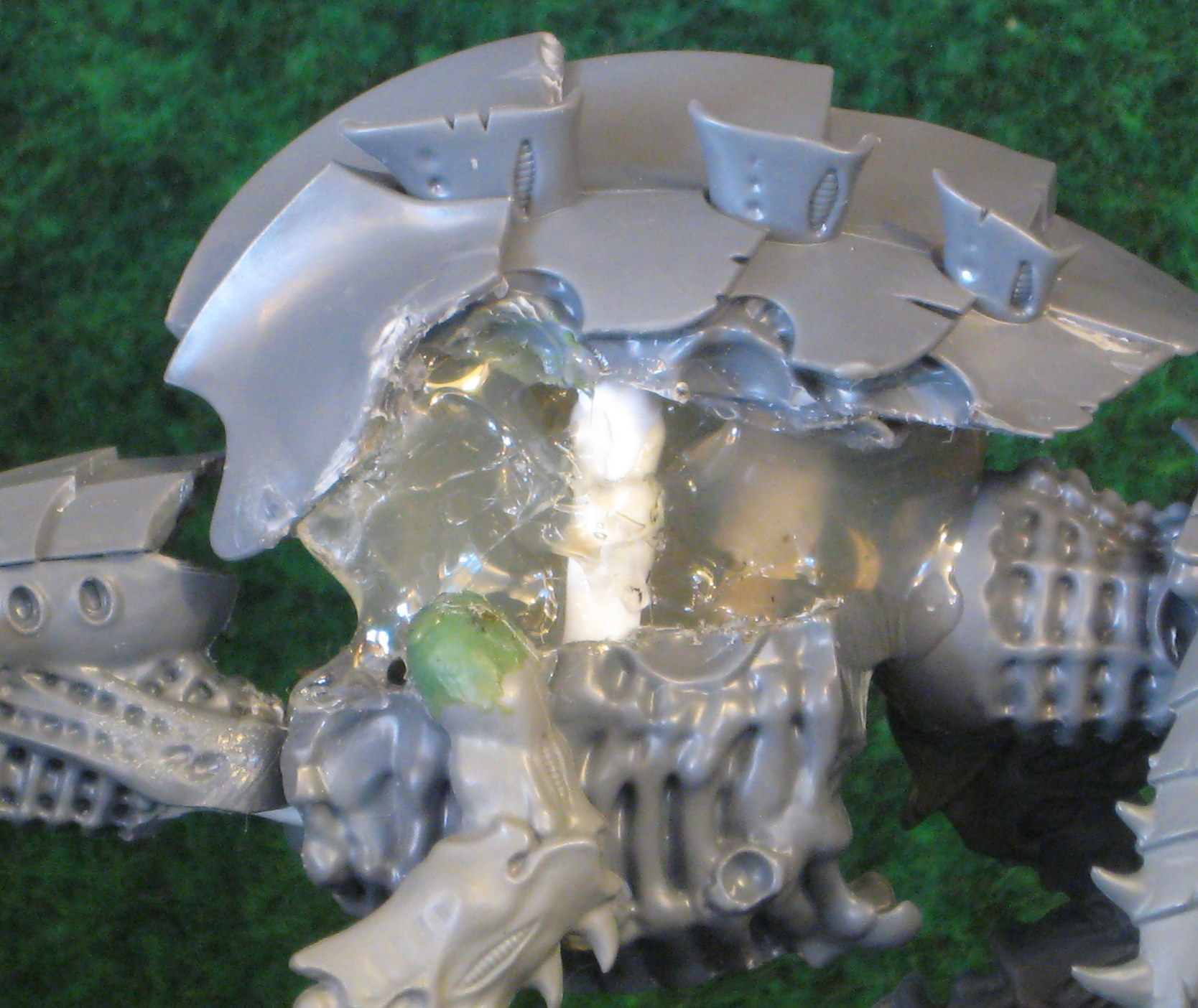 Because I can only watch so many soap operas during the long days at home? Anyways, this should give him a sizable more bulk, while not intruding onto the T-Fex's "wide load" turf. Plus now I won't have to sculpt on a new front edge of the carapace. Still want me to try and make a tutorial up as I go along?